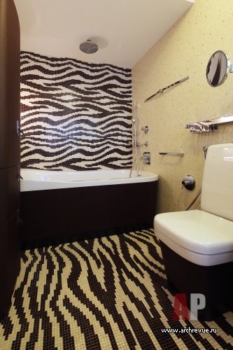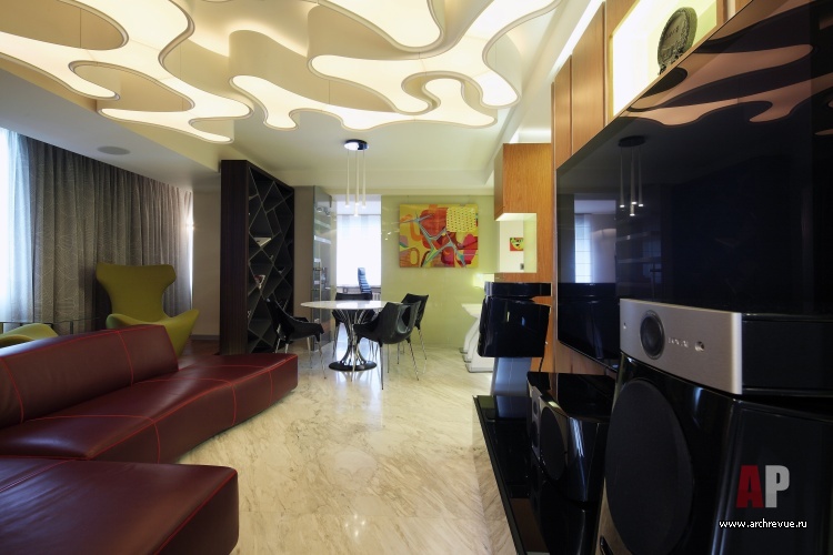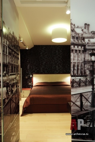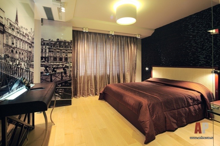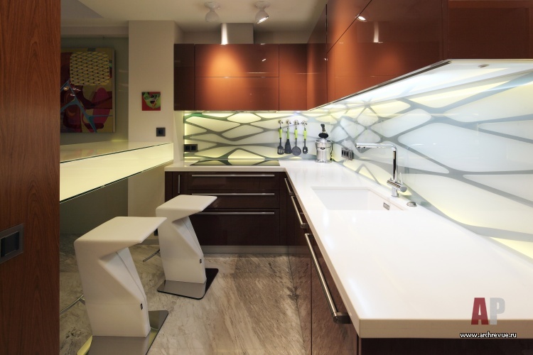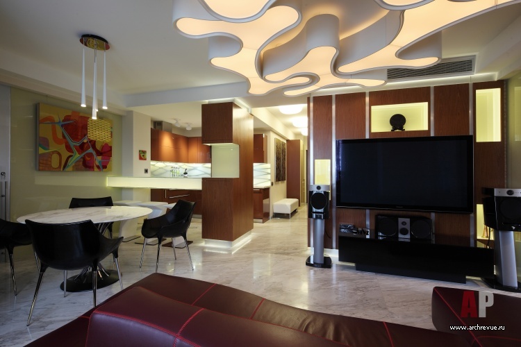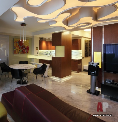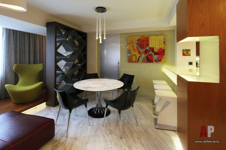 Светильники отвлекают внимание от небольшой высоты потолков и служат художественной доминантой пространства. Панели и встроенная мебель из древесины ореха организуют плоскости стен и визуально зонируют общий объем. Изделия из стекла (двери, столешница барной стойки и кухни, кухонный фартук), светлые лаковые панели придают интерьеру легкости. Современная дизайнерская мебель и актуальная живопись завершают облик комфортного городского пространства.