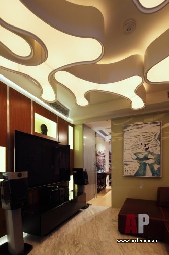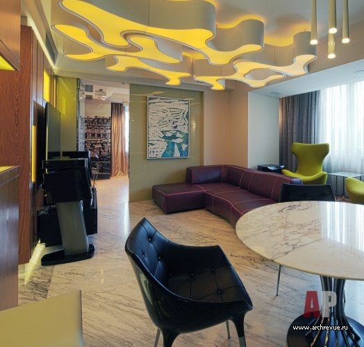Интерьер исполнен в современной узнаваемой стилистике бюро «ЛВА-Интерьер»: жесткий урбанизм смягчен теплыми фактурами дерева, акцент сделан на крупные формы. В данном случае – оригинальный декор потолка – группу из светильников фабрики Vibia с бионическими формами.