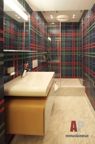 Спальня, гостиная, совмещенная с кухней и столовой, кабинет расположены на одной оси. От центральной гостевой зоны приватные помещения отделены дверями из матового стекла, когда они открыты, квартира воспринимается как единое целое. Помимо жилых помещений в ней предусмотрен два санузла: хозяйский (примыкает к спальне) и гостевой (вход из прихожей).