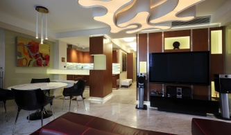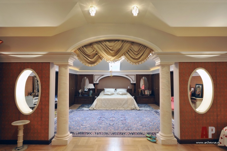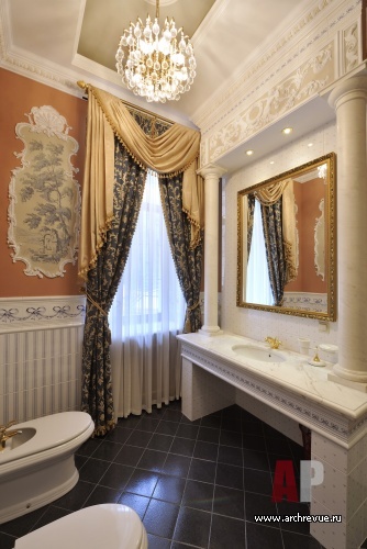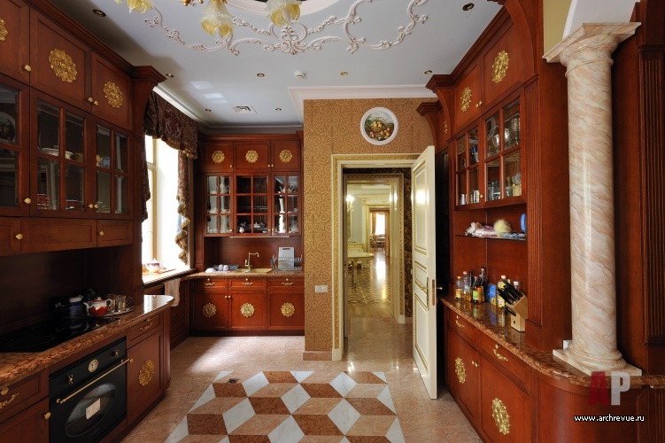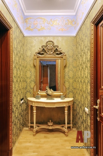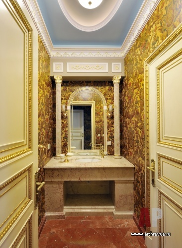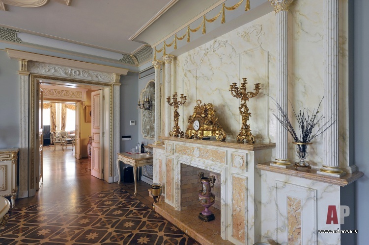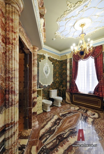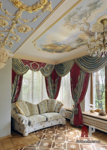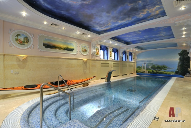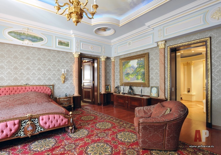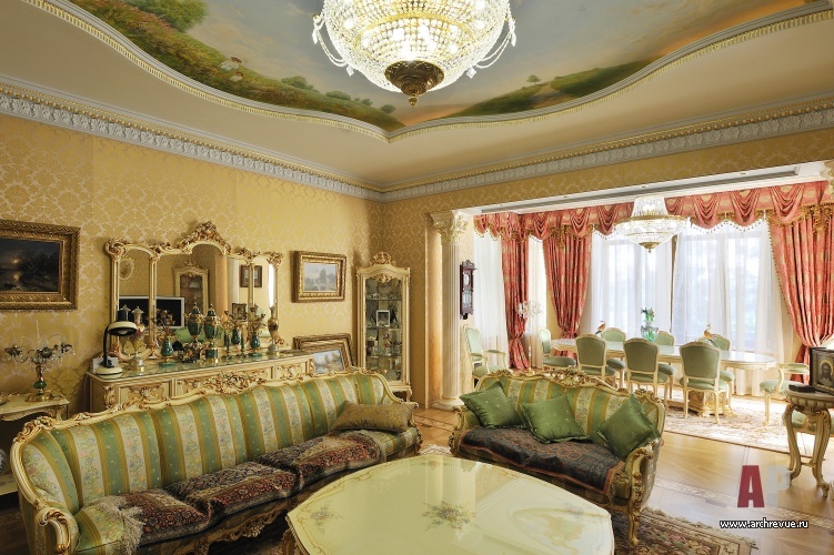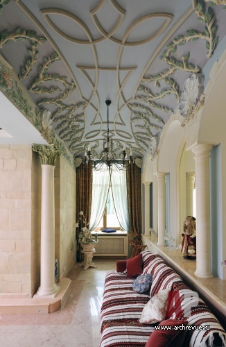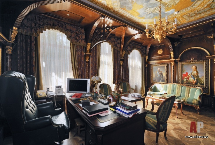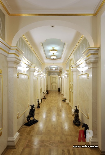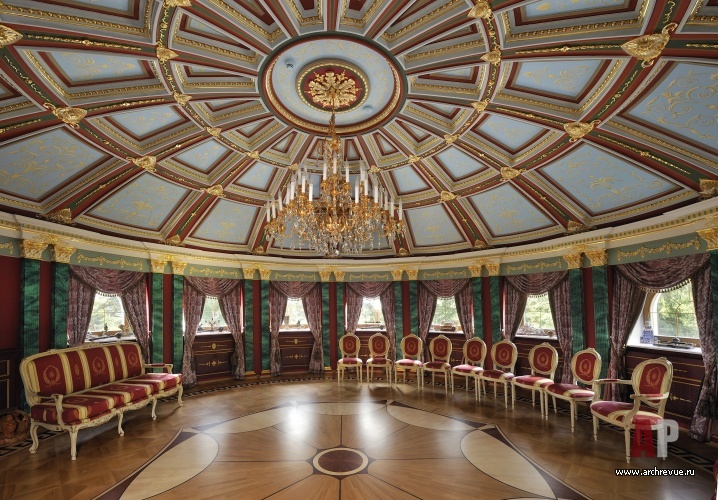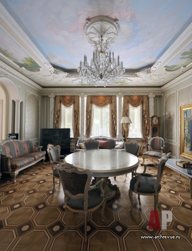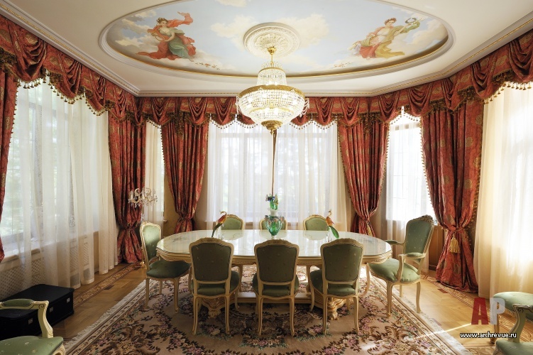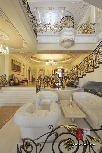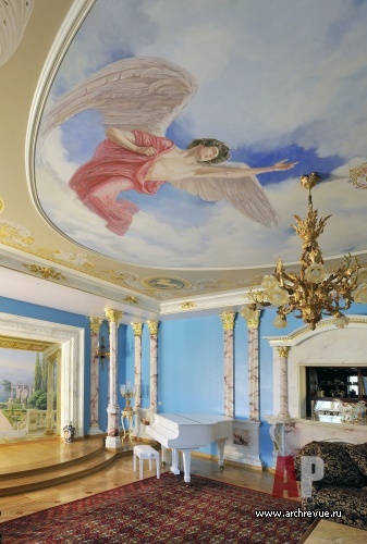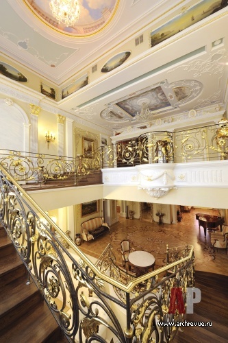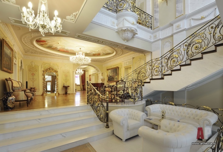 Интерьер полностью авторский, каждая деталь в нем изготавливалась на заказ, с детальнейшей проработкой. Одних только вариантов финишной отделки дверей здесь 17 видов, все столярные изделия изготавливались на итальянской фабрике Ceccotti. Художественное литье в оформлении лестницы, лепной гипсовый декор, фресковая и станковая живопись, сусальное золото, шелка в обивке стен… Таковы дворцы сегодняшних дней.