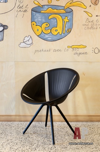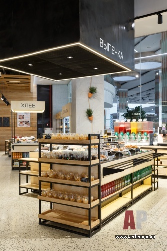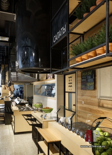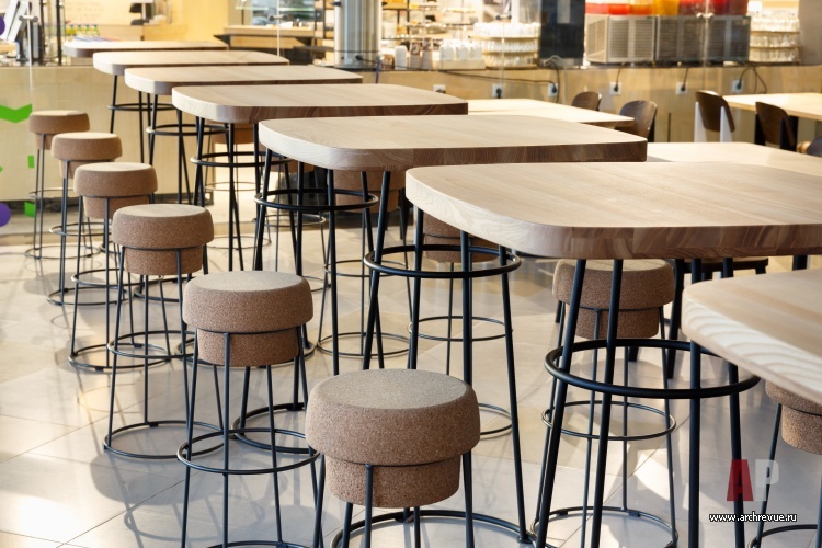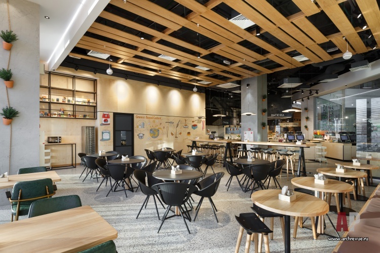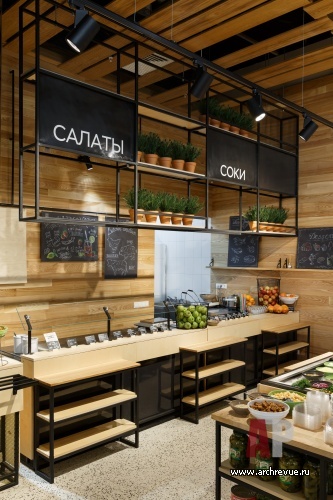 Ощущение фермерского рынка создается благодаря обилию дерева в интерьере. Некрашеная фанера и шпон ясеня применяются как в изготовлении стеновых панелей, так и большей части корпусной мебели. Лаконичные по дизайну станции с едой, столы, витрины из фанеры с металлом выполнены в современном скандинавском стиле.