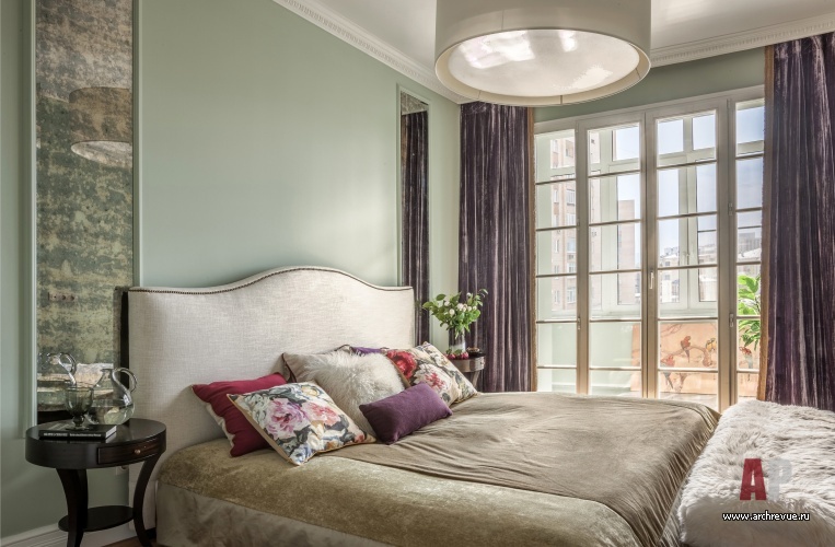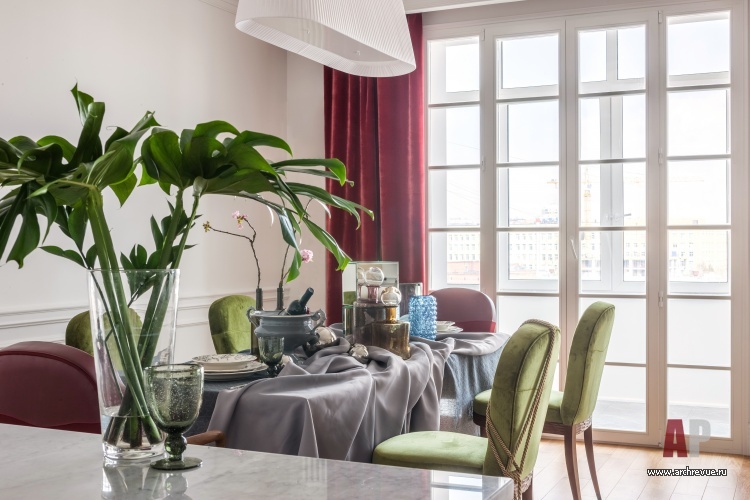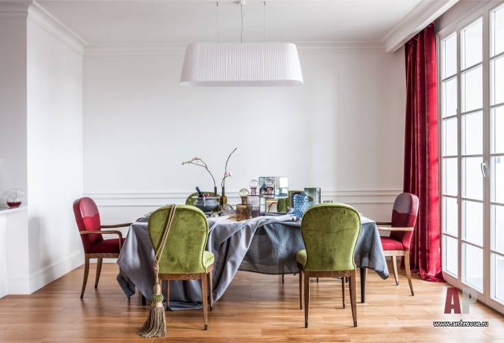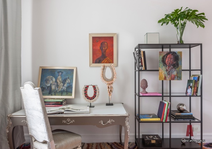 Квартира оформлена в духе современной классики. Белые стены с гипсовой раскладкой, высокий плинтус, мебель пышных форм, дощатый пол, а также белые с деревянными переплетами окна до пола отсылают к традиционным французским интерьерам. На них намекают и старинные китайские свитки, вазы, стеклянные и другие аксессуары, привезенные из Азии и вызывающие в памяти французские интерьеры шинуазри.