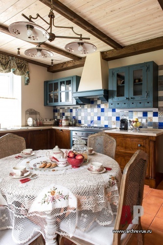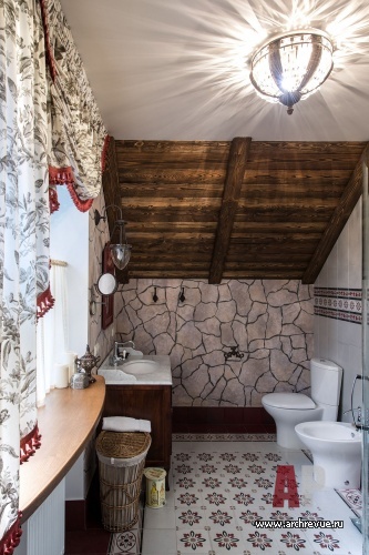 Интерьер дома выполнен в стиле шале: с характерной архитектурой, декором и настроением. Весь объем оформлен в единой пастельной приглушенной гамме, с которой контрастирует отделка стен, полов, потолков тонированным орехом. Стены облицованы диким камнем или фактурной штукатуркой, шторы, скатерти, чехлы для мебели выполнены в деревенском стиле, мебель выбрана удобная, добротная, массивная.