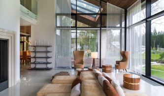 Первый этаж двухэтажного шале занимают общественные помещения, самое значимое из них – общая гостиная-столовая с камином и библиотекой. Камин с французской чугунной двухсторонней топкой отделяет парадную часть от боле камерной зоны отдыха с библиотекой. Кроме общей зоны на нижнем уровне находится гостевая комната и гостевой санузел.