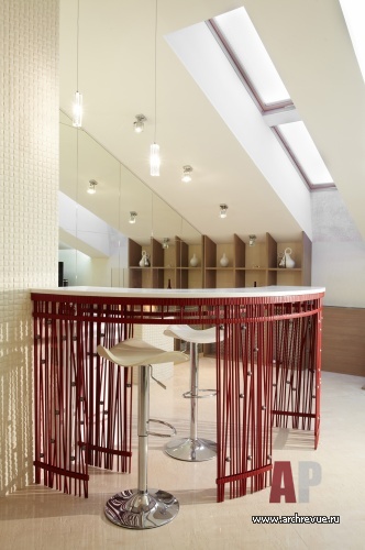 Квартира располагается в мансардном этаже с наклонным бетонным потолком, максимальная высота которого 5 метров. Необычная архитектура позволила поиграть с пространством и создать нетривиальный интерьер, центром которого является зона отдыха с баром, камином и водопадом. Спальня расположена на верхнем уровне, куда ведет стеклянная лестница, словно парящая в пространстве.