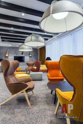 Несмотря на то, что общие зоны – HUB офиса больше всего напоминают клуб или лобби комфортабельного отеля, они предельно насыщены современными технологиями. Вся корпусная мебель имеет встроенные розетки, USB-порты; использованы акустические и видео системы последнего поколения. Согласно правилам Microsoft представительство компании в каждой стране должно отражать национальную идентичность. В московском офисе за основу была взята тема исторических и культурных достижений России.