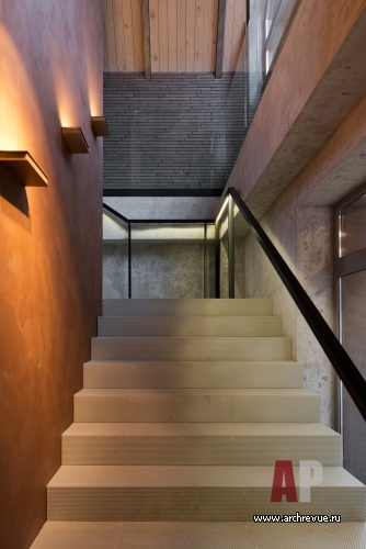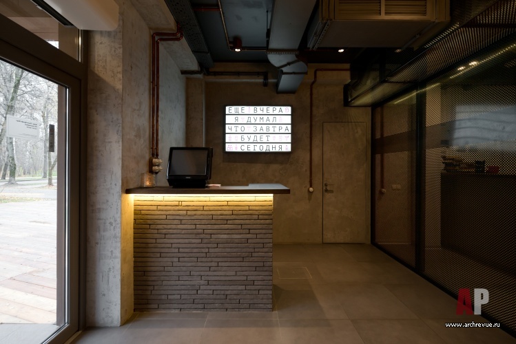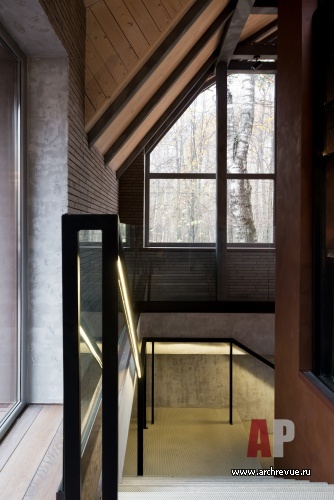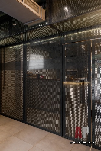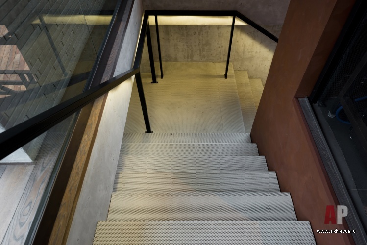 «При проектировании интерьера мы намерено добивались эффекта контраста пространств первого и второго этажей, подчеркнув камерность атмосферы внизу и создав абсолютно открытую и визуально чистую зону наверху. Таким образом, мы акцентировали основную идею проекта – преодоление современным жителем мегаполиса городской суеты и достижение единения с природой в сложной и насыщенной урбанистической среде. Чтобы добиться наиболее яркого выражения этой идеи, большинство элементов мебели были разработаны нами на заказ, включая металлические перегородки с перфорацией и лестницу. Подобный авторский подход становится хорошей традицией нашего бюро, ведь в интерьере важна каждая деталь…»