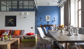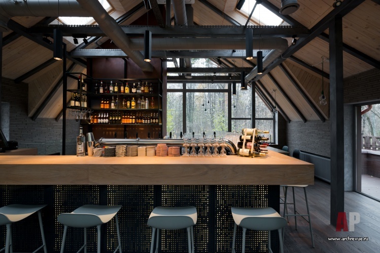 На одном из подмосковных заводов по эскизам были изготовлены перфорированные металлические листы, из которых выполнены перегородки первого этажа и низ барной стойки. Смонтированная за листами подсветка создает на металлической поверхности необычный рисунок, который визуально обогащает пространство. Своего рода вертикальным контрапунктом интерьера служит лестница – уникальная конструкция, ступени которой выполнены из листового металла с перфорацией, ограждения – из закаленного стекла с подсветкой по периметру, а поручни – из стальных труб, выкрашенных в черный цвет. Жесткость металла смягчает клинкерный кирпич в отделке стен и дерево: подшивка потолка дубовыми панелями, половая доска с брашировкой и столешница барной стойки, выполненная из массива дерева с живописной текстурой. Современную эстетику поддерживают открытые потолочные коммуникации и брутальные фактуры с эффектом ржавого металла и бетона. Демократичный настрой вносит мебель и аксессуары из коллекций европейских дизайнеров.