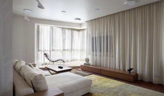 Квартира имеет классическую структуру: пространство четко разделено на две самостоятельные зоны – общественную и приватную. Общественный блок включает гостиную с каминной группой и выходом в зимний сад (он организован на присоединенной лоджии) и изолированную кухню-столовую. Приватные апартаменты в свою очередь поделены на родительские и детские помещения (для двух детей – сына и дочери).