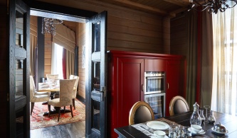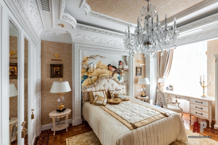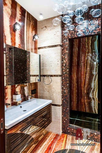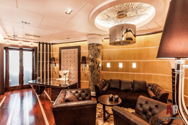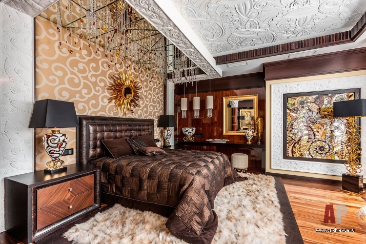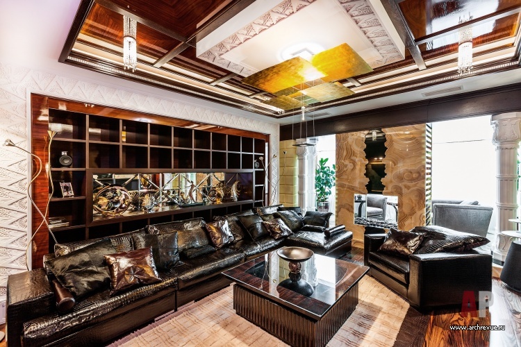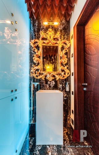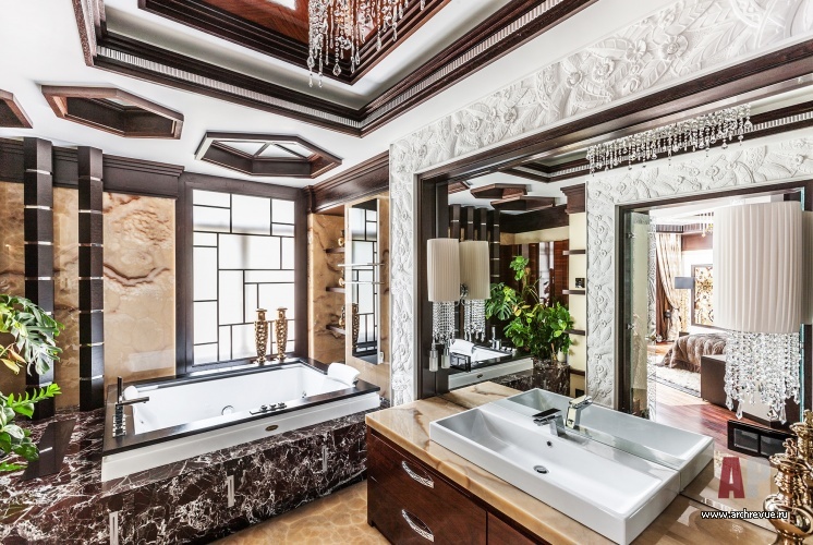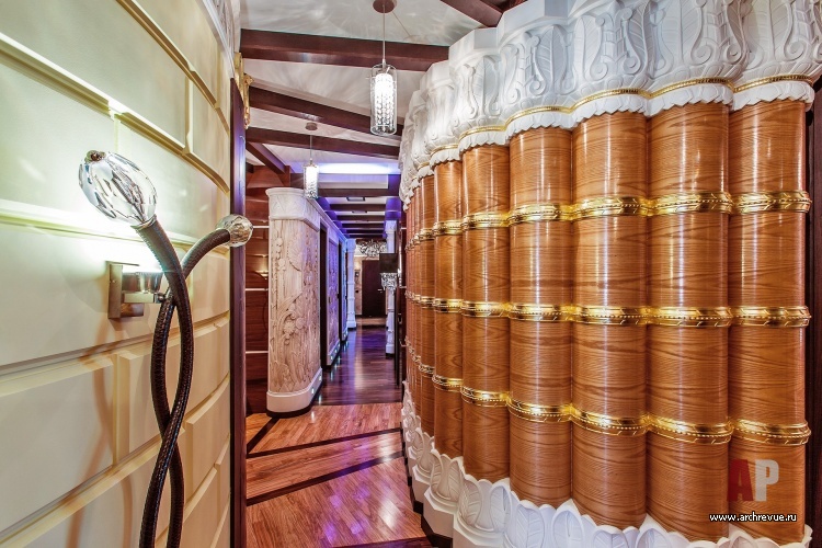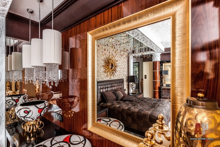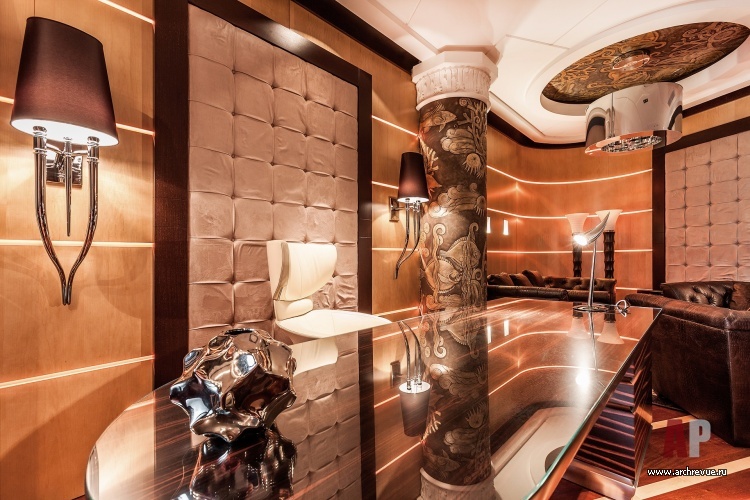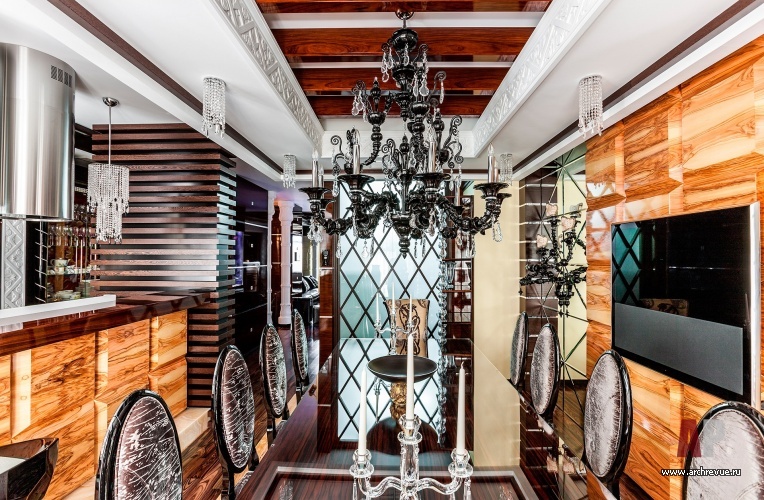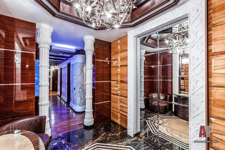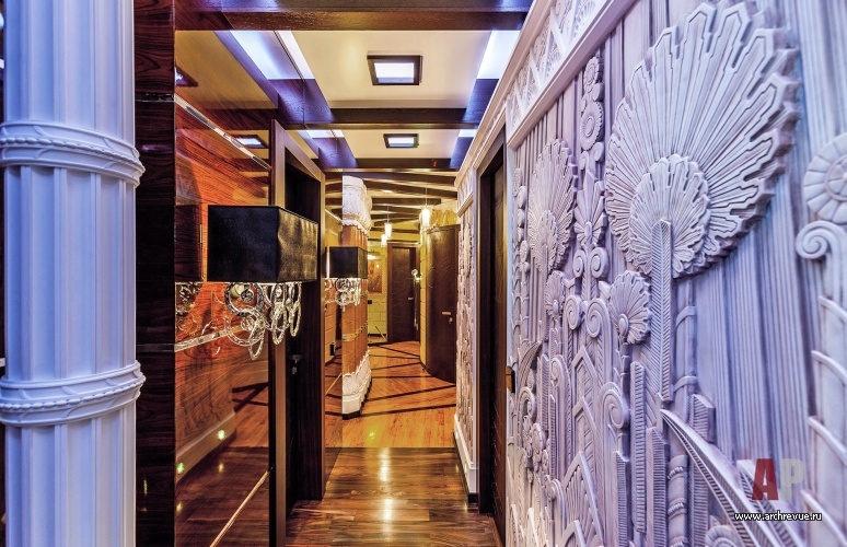 В этом проекте архитектор реализовал идею сложного, насыщенного интерьера: полностью рукотворного, эклектичного и впечатляющего. При этом за счет грамотно организованного зонирования несмотря на плотный декор квартира не выглядит перегруженной, каждая деталь в ней точно найдена и обоснована. Витражи, росписи, лепнина, зеркала с фацетами, каменные панно, изделия из венге, зебрано и полированного палисандра складываются в многоголосый интерьер с ясной и четкой структурой.