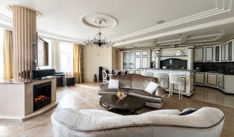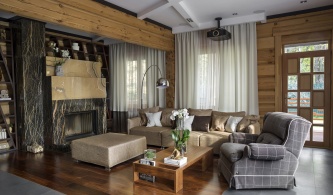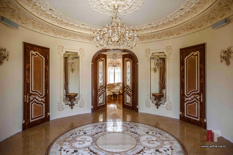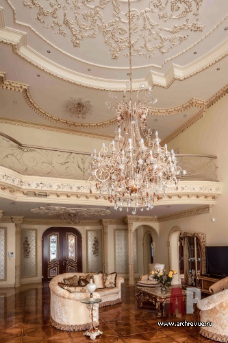 Резиденция имеет традиционную планировку с парадными общественными залами внизу и приватными помещения наверху. Смысловой центр гостевого пространства – холл с двухсветной гостиной и торжественным классическим декором, который сменяется помпезной столовой, анфиладной кухней и более камерным каминным залом.