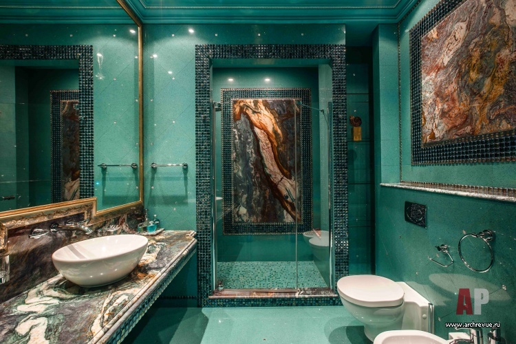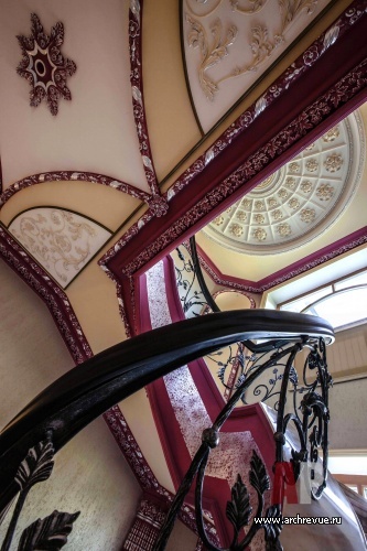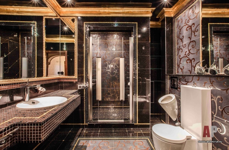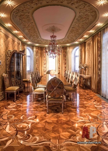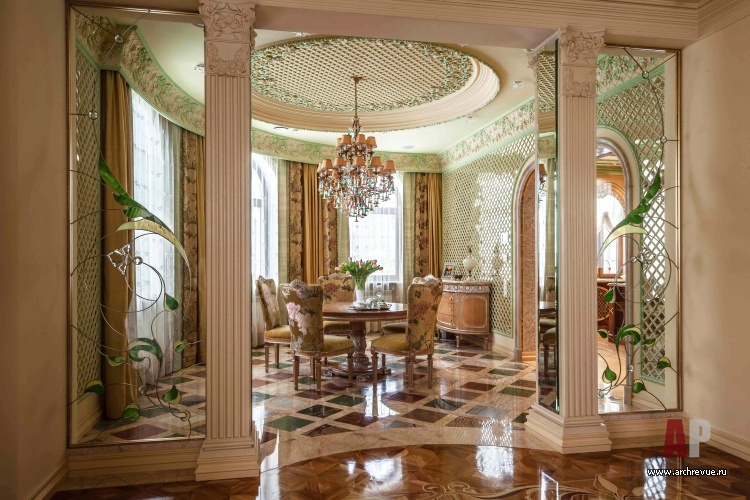 В интерьере использован весь арсенал декоративных средств, которые традиционно ассоциируются с роскошью. Редкие сорта камня, экзотические породы дерева, художественный паркет, авторский лепной декор из гипса, мозаичные панно, витражи, росписи… Особенное сияние в интерьере создает оригинальное декоративное покрытие стен с эффектом блеска и мерцания, оно еще больше загорается при попадании солнечных лучей.