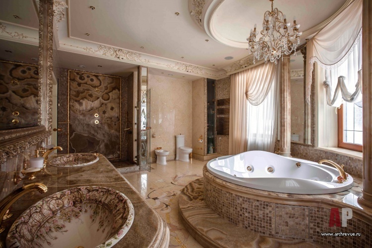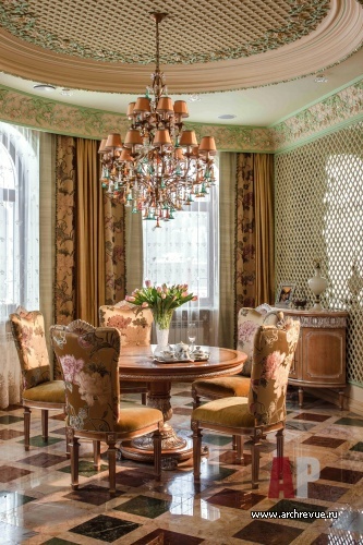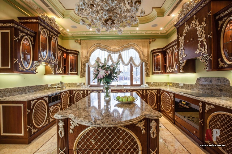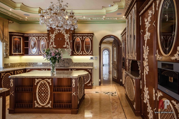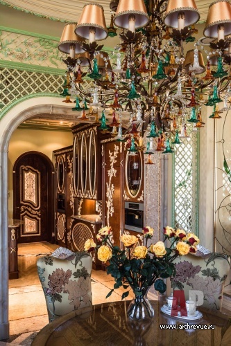 Каждое помещение в доме посвящено своему цветочному орнаменту. Так, из входа в виде ротоны среду кустов роз, попадаешь в барочную каминную, всю сплошь в изящных цветочных росчерках, затем на кухню, гарнитур которой выполнен по индивидуальному дизайну и украшен цветами вишни. Цветочные орнаменты и панно составляют основу дизайна необычайно парадных ванных комнат и спален.