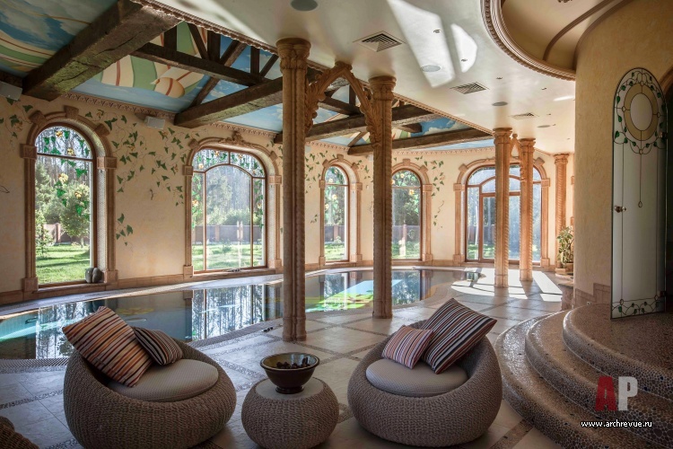 Одно из любимых помещений хозяйки дома – зона для завтраков, которая обыграна как круглая ротонда-беседка в саду. Этажи объединяет каменная волнообразная лестница с ажурным кованым ограждением. Отдельным блоком спроектирована зона для отдыха и релакса: с бассейном, комплексом помещений для спа-процедур.