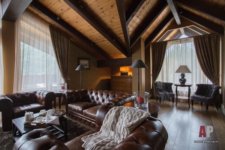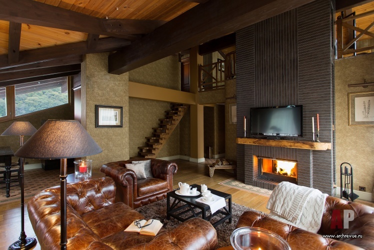 За основу дизайна взята стилистика горного шале, усложненная традиционными английскими мотивами. Потолки мансарды подшиты лиственницей с контрастными балками, стены оформлены бумажными обоями в классическом английском стиле. Доминанта интерьера – камин с высокой топкой, он облицован черной плиткой, которая придает ритм и масштабирует пространство.