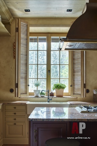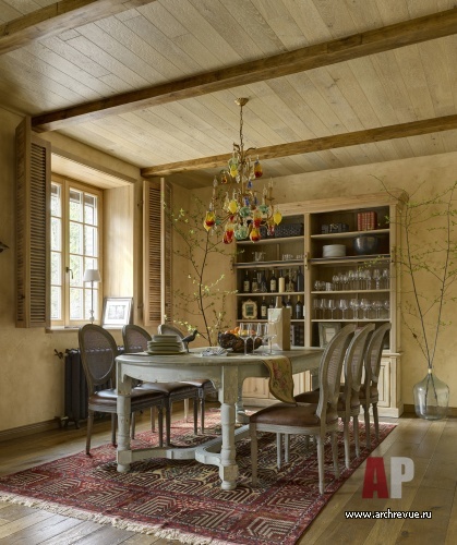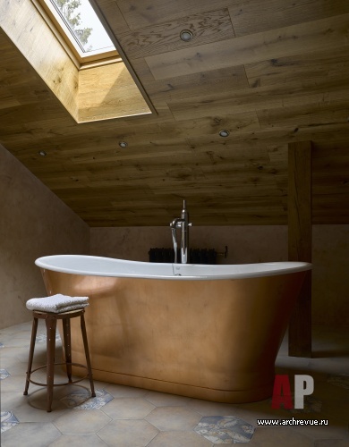 Особое внимание уделено изделиям из дерева: на полу – широкая дубовая доска, потолок столовой подшит панелями с тиснением, окна обрамлены оригинальными ставнями из древесины сосны, в отделке второго этажа и вовсе использовалась доска с уникальной брутальной текстурой: шероховатая, словно состаренная от времени. Живописные балки сделаны из старой сосны, дверные наличники и камин второго этажа отделаны медью. Каждый предмет в доме имеет свою историю, что также соответствует образу интерьера, который складывался постепенно, несколькими поколениями семьи.