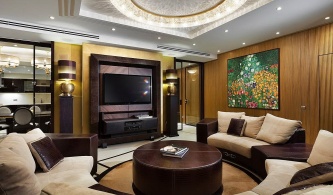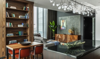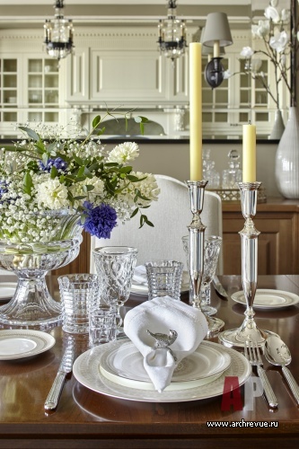 Квартира площадью 180 кв. м имеет предельно рациональную планировку, которая позволяет сохранить ощущение простора, света, больших пространств и открытых перспектив. Центральное место в ней занимает гостиная с симметрично расположенными книжными шкафами и мягкой группой. Согласно пожеланиям заказчиков, кухня объединена с парадной столовой, из помещения через французские окна также можно попасть на балкон с видами на парадную Москву.