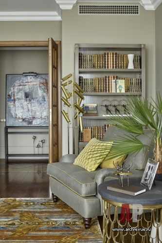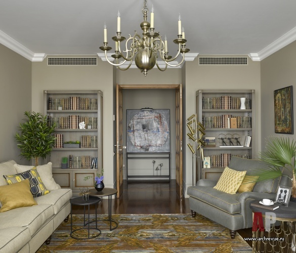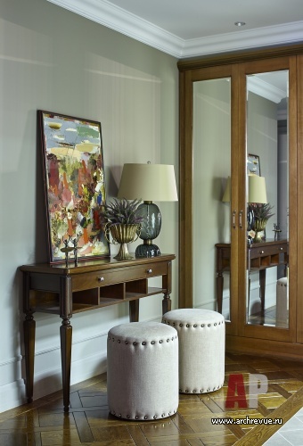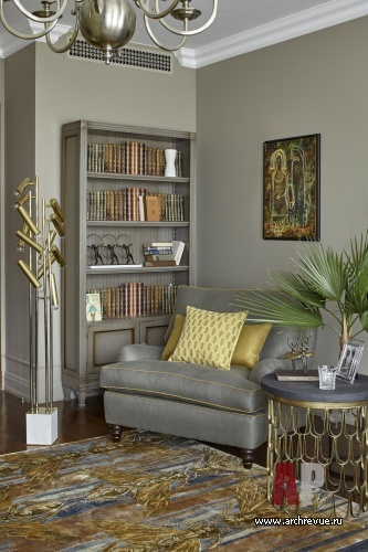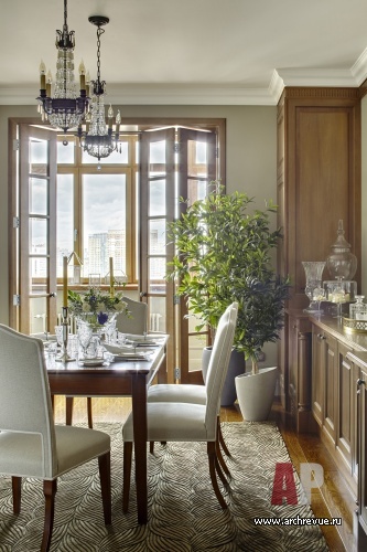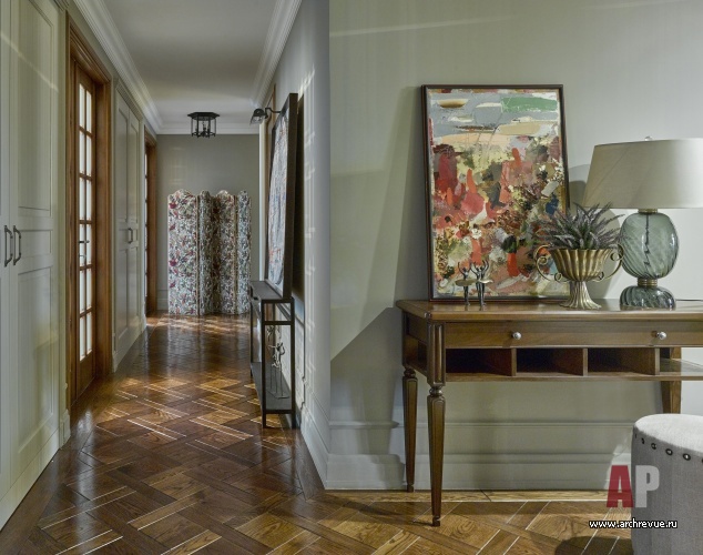 Авторы проекта признаются, что при проектировании квартиры они вдохновлялись английскими интерьерами, эклектичный образ дополнили характерными классическими элементами: дубовым паркетом, распашными филенчатыми дверями с витражами, лепными карнизами, которые отливали прямо на месте, высокие плинтусы… Интерьер выдержан в припыленных бежевых и серых тонах, которые «подстраиваются» под московский климат, отчего пространство выглядит по-разному.
