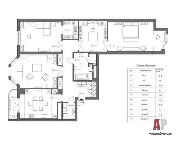 Две спальни расположены в глубине пространства, друг напротив друга. Каждая из них имеет свою гардеробную. Прихожая, холл, большая ванная комната, гостевой санузел и технический блок дополняют набор жилых помещений.