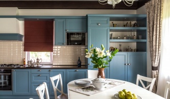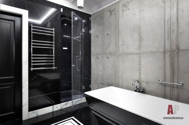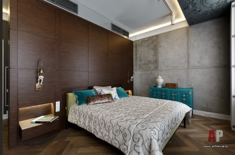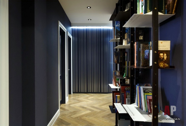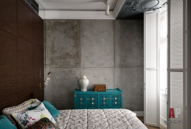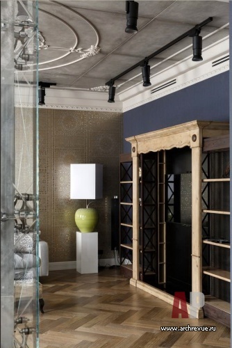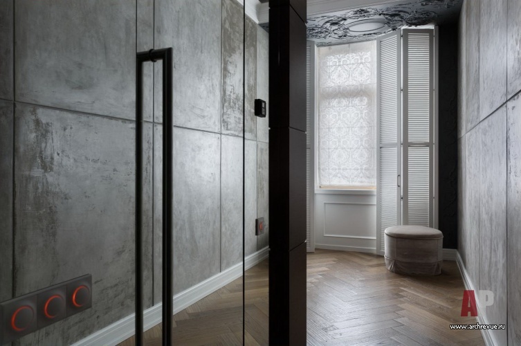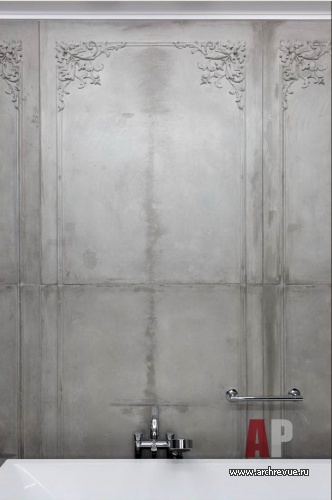 В оформлении интерьера квартиры архитекторы вдохновлялись петербургскими пейзажами: набережными Невы, видами на залив, пасмурным небом, а также тесно переплетенной классической и современной архитектурой города. Отсюда столь смелая цветовая гамма: открытый синий, пастельный бирюзовый, припыленный зеленый… Основной декоративный прием – использование в отделке стен и потолков архитектурного фибробетона, имитирующего классические лепные элементы и буазери.