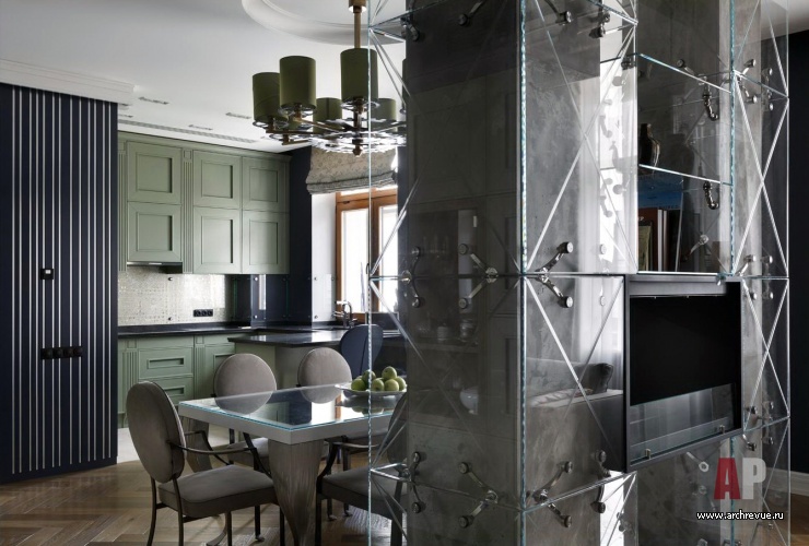 В квартире свободной планировки по центру общей зоны застройщики разместили несущую колонну. На нее-то архитекторы и ориентировались при зонировании пространства: в поддержку в конструктивной колонне они выстроили еще одну и объединили их в эффектный двухсторонний стеллаж, который разделил гостиную и кухню-столовую. Стеллаж оформлен по принципу вентилируемых фасадов стеклянными панелями на металлических кронштейнах и вносит в интерьер индустриальную ноту.