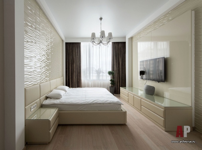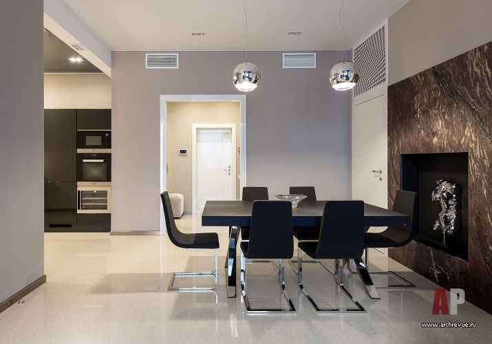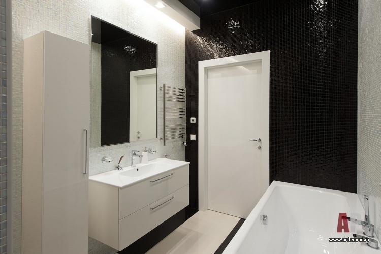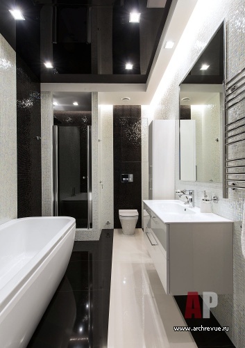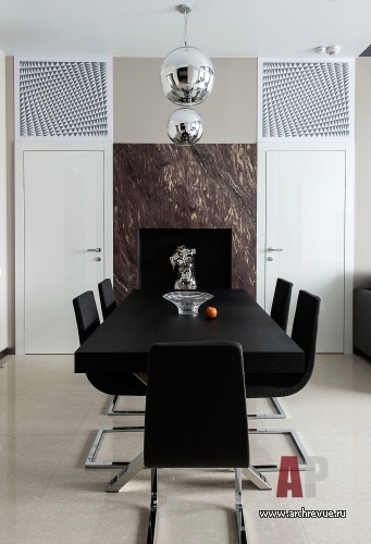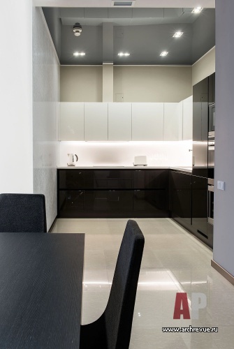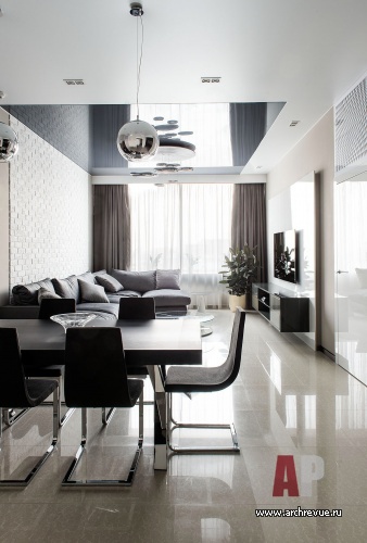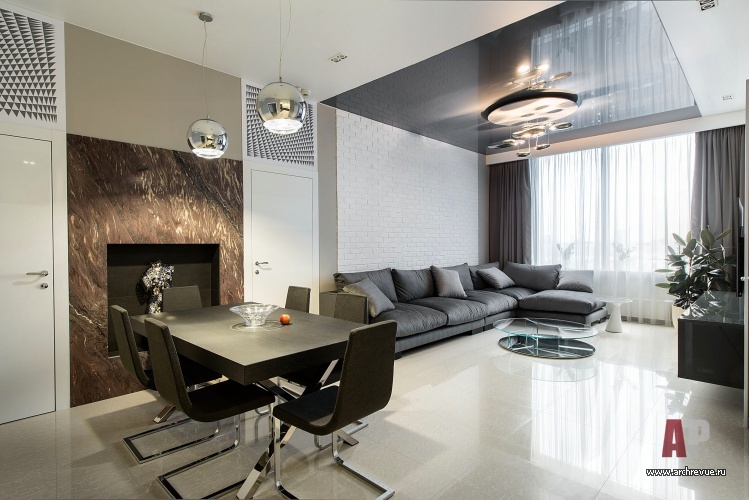 Каждый элемент декора служит задаче визуального расширения пространства. Глянцевые натяжные потолки темно-серого цвета, лакированные стеновые панели с гладкой и рельефной поверхностью, мебель с полированными фасадами и стеклянными элементами, прозрачные шкафы, люстры с зеркальным эффектом, двери Invisible из белого глянца наполняет интерьер множеством бликов и отражений.