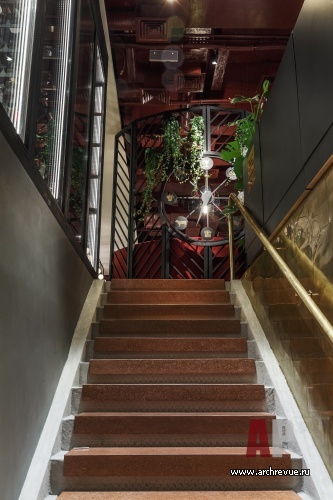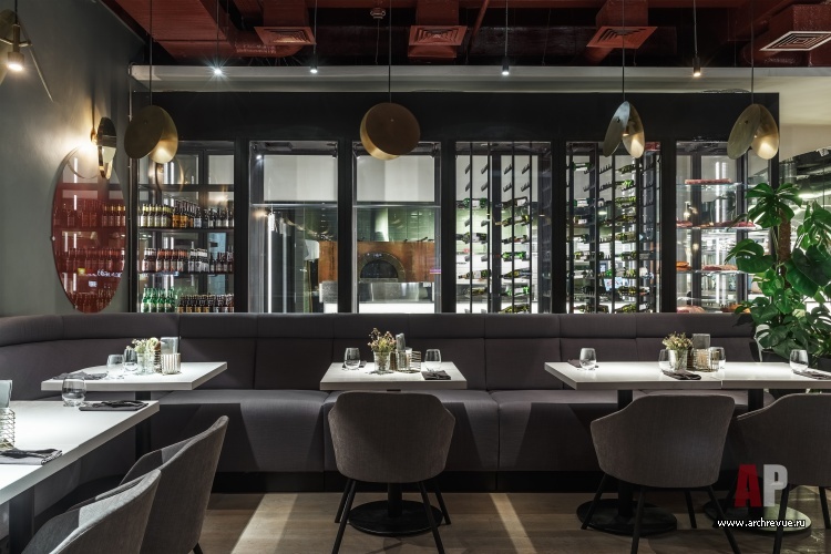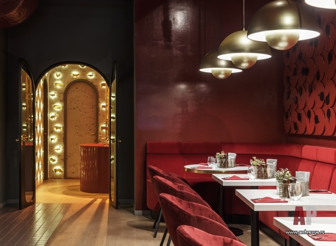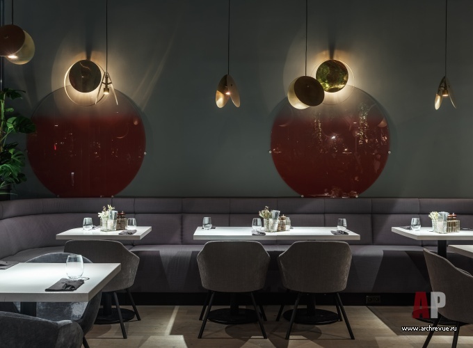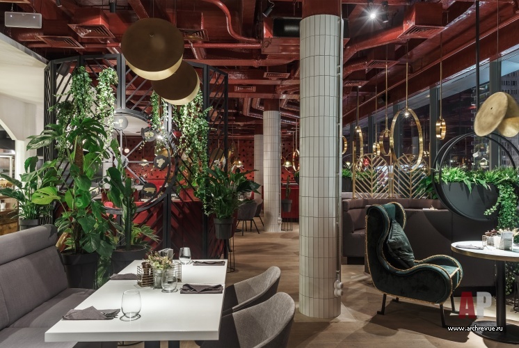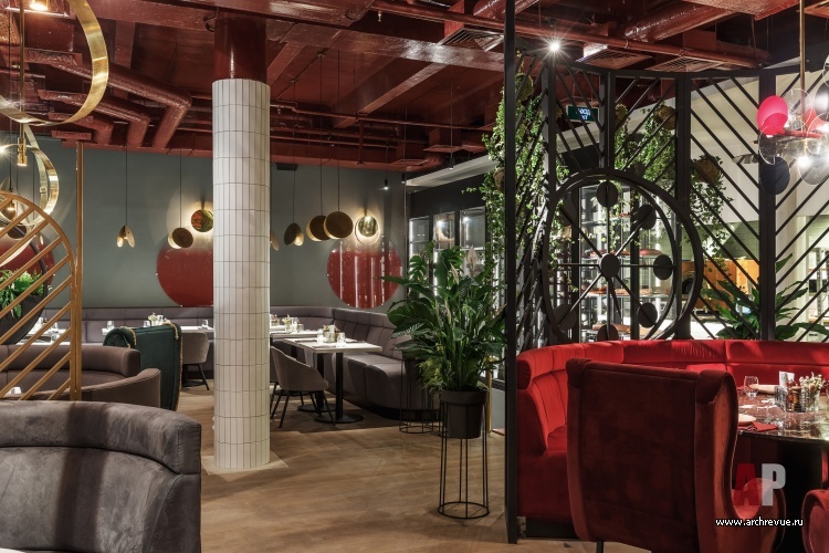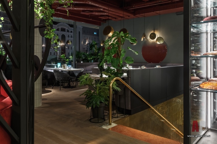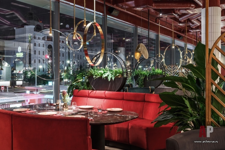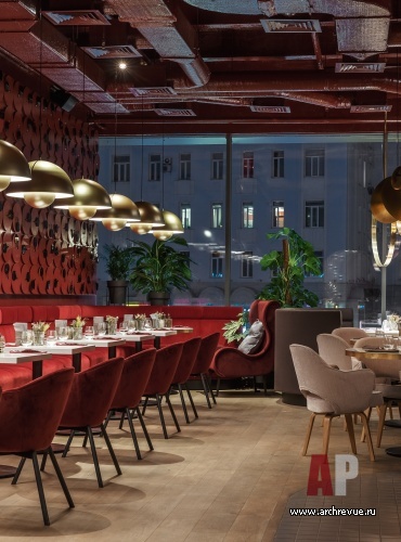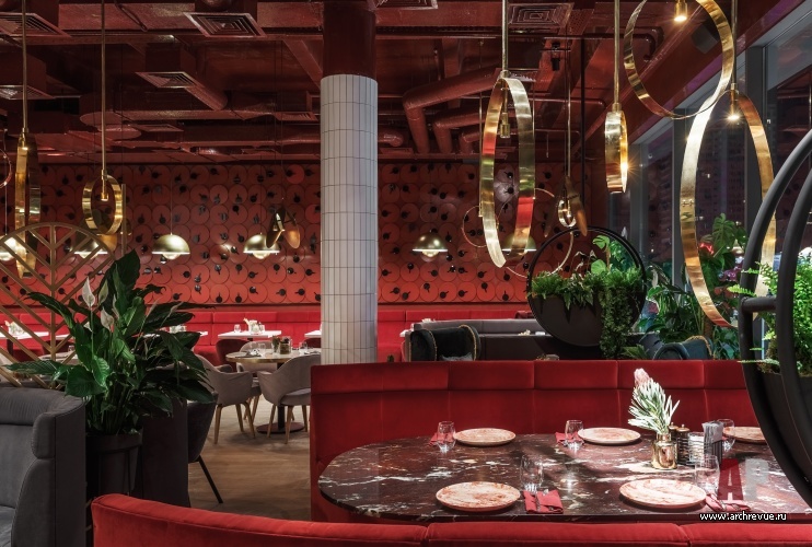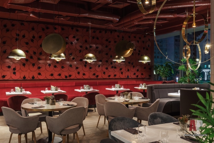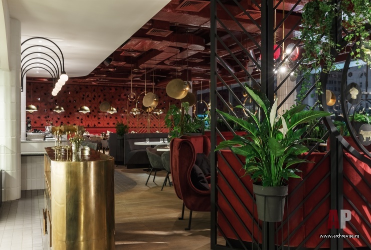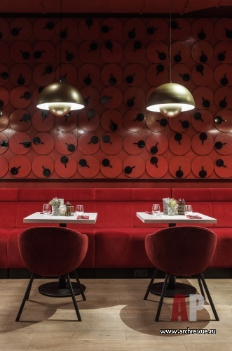 Интерьер ресторана – калейдоскоп образов и ассоциаций, связанных с мясом, мясоедством и аппетитными мясными блюдами. В оформлении использованы насыщенные темно-красные, мясные оттенки, которые уравновешиваются зеленой и серой обивкой бели и живыми растениями. «На оформление всего потолка ярким насыщенным цветом марсала с глянцевым финишем подтолкнули столешницы из бразильского гранита, напоминающие мясной отруб с мраморными прожилками, - отмечает дизайнер проекта.