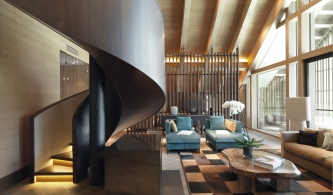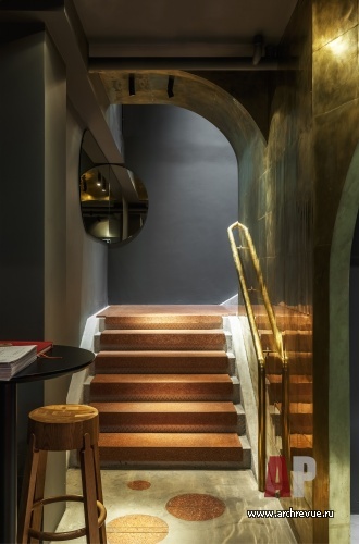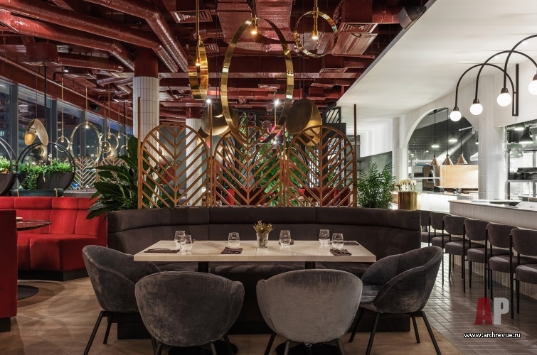 Остальные посадочные зоны с диванами и креслами зонированы отлично работающими на просвет перегородками из латуни или черненого металла, напоминающими решетки гриля.