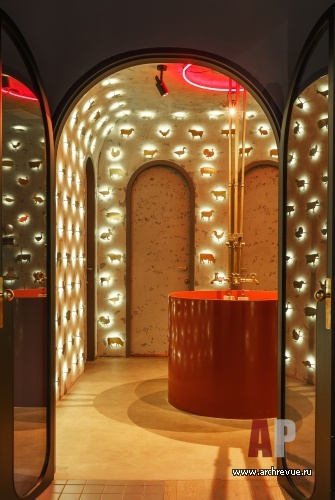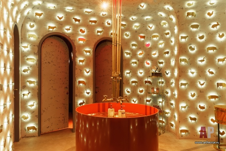 Тему круга, заданную формой 2-х метрового гриля, поддерживают круглые стеклянные панно градиентом в цвет потолка, латунные светильники-кольца, бар со скругленными углами, круглые арочные двери в туалетах, а также 252 уникальных стеновые панно в виде дисков с движущимися механизмами-сковородками и барабан для игры-лотереи на входе. Апогей мясной темы – туалетные комнаты: фигурки латунных зверей, подсвеченных от пола до закругленного потолка, создает впечатление, будто ты сам находишься в пироге мясника вместе с сочной начинкой.