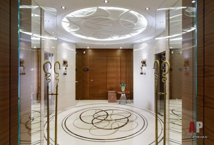 Архитекторы предложили вариант с четким разделением объема на общественную часть и приватный блок с 4-мя спальнями. Разные по назначению помещения связывает центральный круглый холл: эффектный и представительский. На одной оси с ним расположена гостиная-столовая-кухня. Другая ось связывает симметричные выходы в приватные апартаменты.