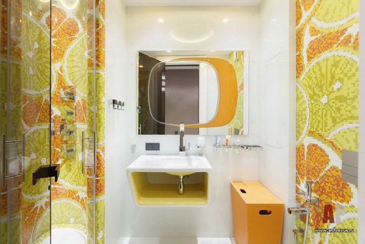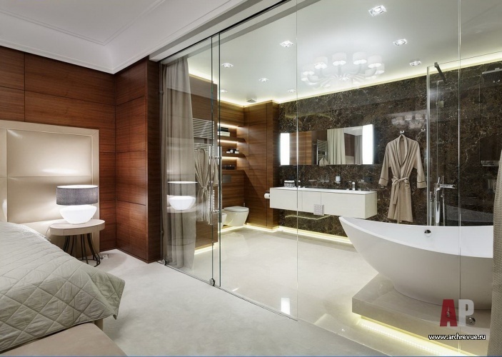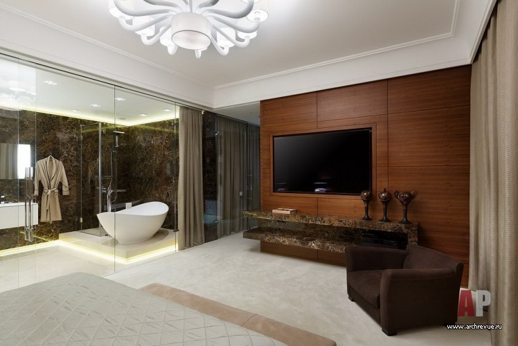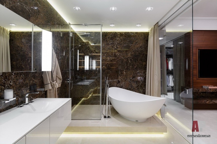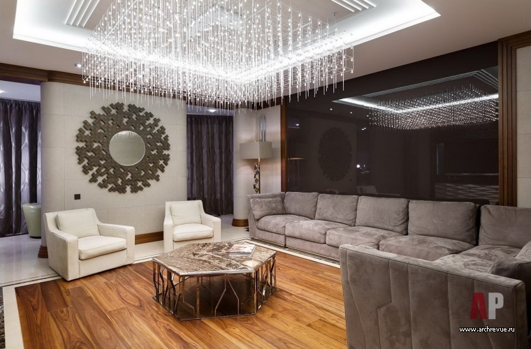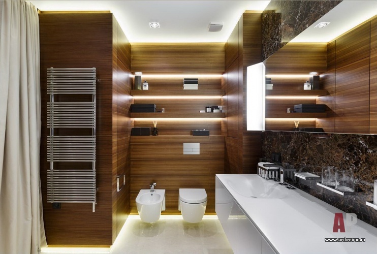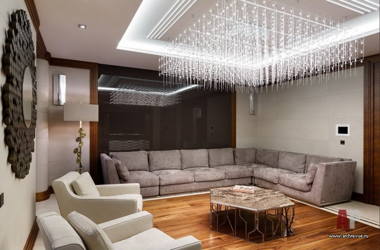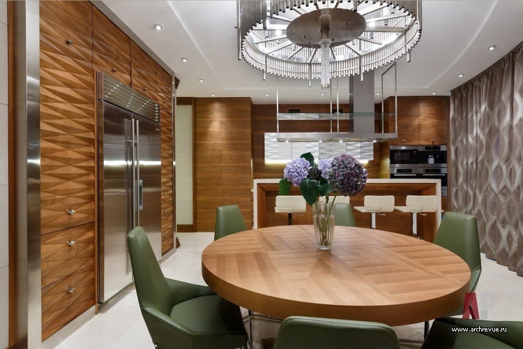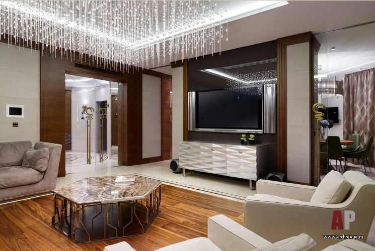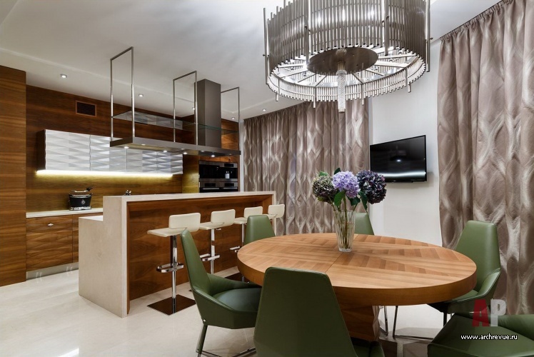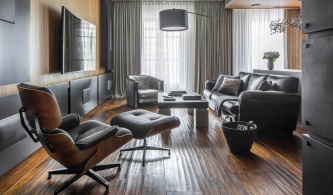 Интерьер квартиры исполнен в стилистике современного ар-деко, в его оформлении использованы натуральные материалы с дорогой текстурой: кожа, камень, редкие породы дерева. Строгая геометрия и сдержанная орнаментика декора также отсылает к интерьерам 20-х годов ХХ века.