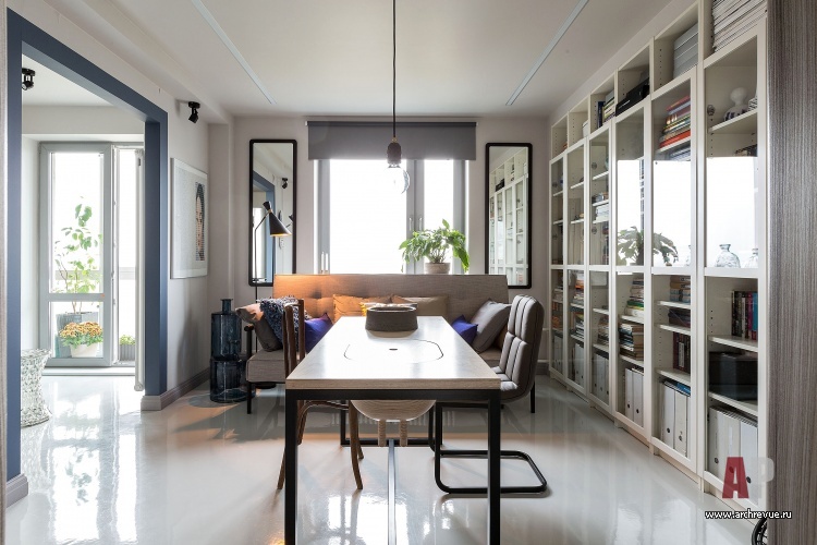 Интерьер квартиры мало напоминает жилье пенсионерки: чистое пространство, монохром, современная дизайнерская мебель, отсутствие мелких декоративных предметов… Только большая библиотека говорит о почтенном возрасте хозяйки. В оформлении дизайнер старалась отразить стиль 1970-х годов: глянцевые наливные полы, серая штукатурка, дизайнерская мебель в стиле ретро отсылают к эстетике тех лет. Но при этом квартира выглядит ярко, свежо и современно.