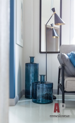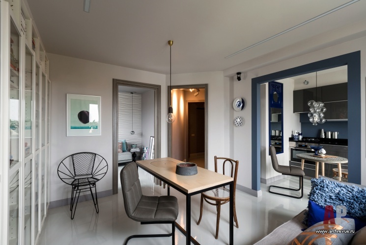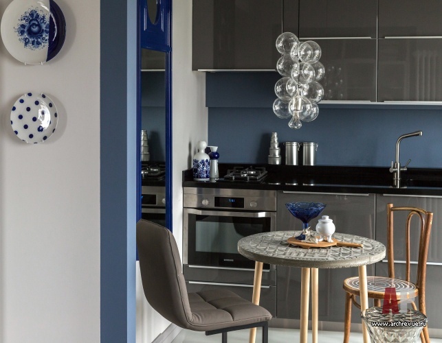 Интерьер квартиры выполнен в стилистике 1970-х годов и согласуется с модернистской архитектурой дома. Все помещения решены в единой цветовой гамме: светлом сером оттенке с насыщенными темно-синими акцентами. Такой прием визуально расширяет пространство, создает иллюзию большого цельного объема.