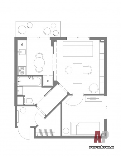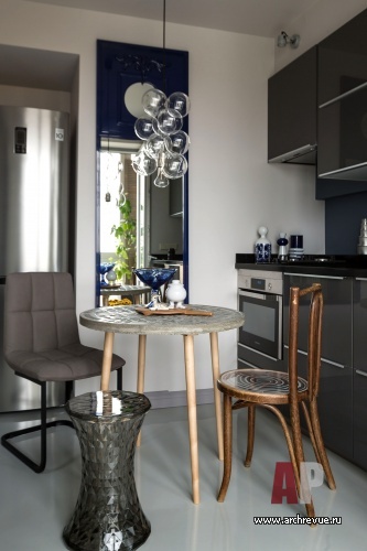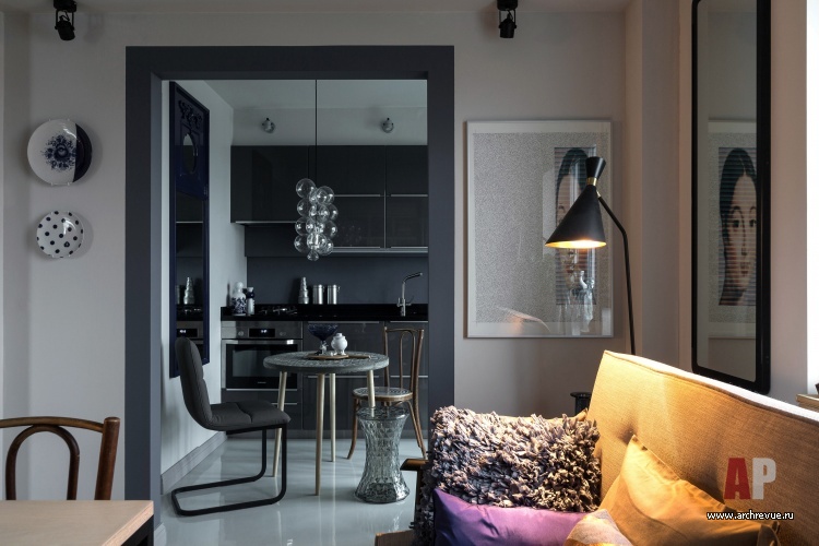 «Я спроектировала килеобразную прихожую, в «киле» которой симметрично расположила два дверных проема. Один ведет в гостиную, второй – в гардеробную. Это решение позволило задать красивую ось входа: войдя в квартиру, мы сразу видим гостиную с гостеприимным обеденным столом, а не узкий коридор, ведущий на кухню», - рассказывает автор проекта Ирина Крашенинникова. Увеличить площадь кухни не удалось, но было согласовано изменение входа, благодаря чему кухня встала на одну линию с гостиной и появилась дополнительная ниша под холодильник. Поскольку квартира предназначена для одного человека, то все три помещения (кухня, гостиная, спальня) можно было сделать смежными, что визуально увеличило общий объем.