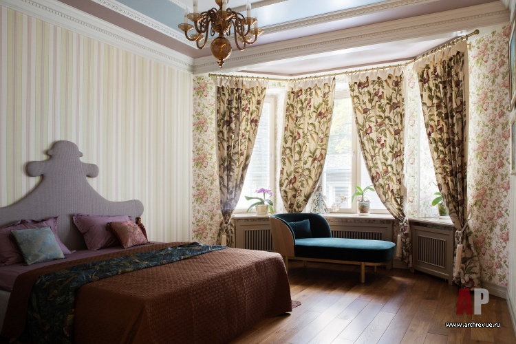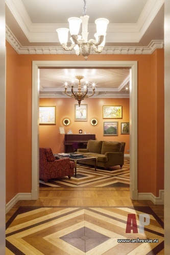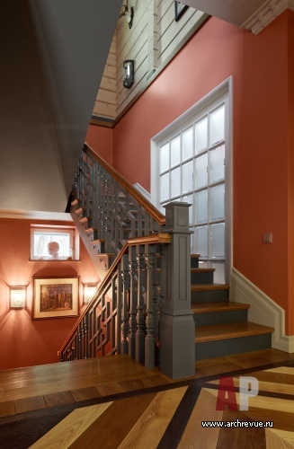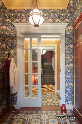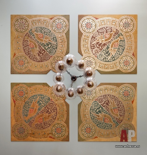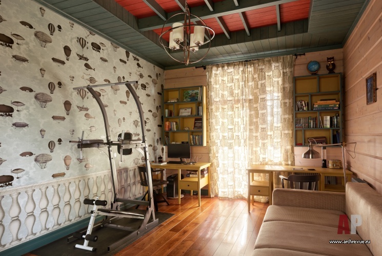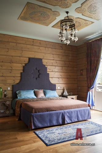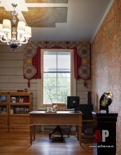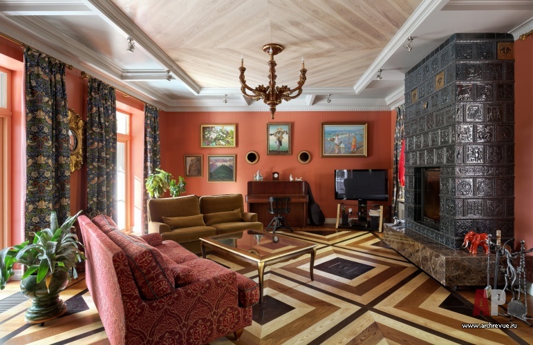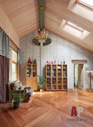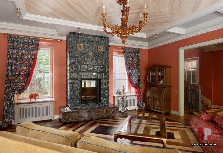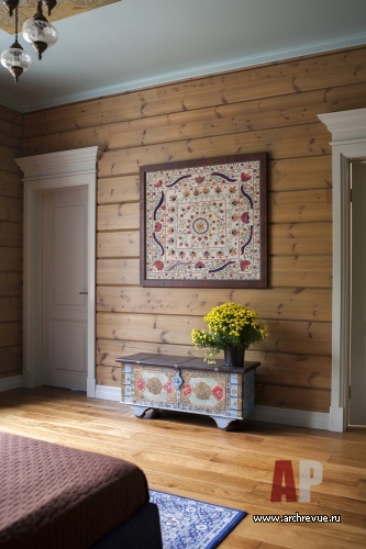 Камин облицевали древнерусскими владимирскими изразцами цвета индиго с изображением былинных животных, потолок хозяйской спальни оформили досками с фольклорной росписью, в рисунок ограждения лестницы добавили китайские мотивы. Столь плотную и разную по характеру декоративную орнаментику уравновешивает строгая архитектура помещений и декор полов. В гостиной и холле использован наборный паркет из разных пород дерева, уложенный большими щитами. Он масштабирует пространство и позволяет верно расставить акценты.