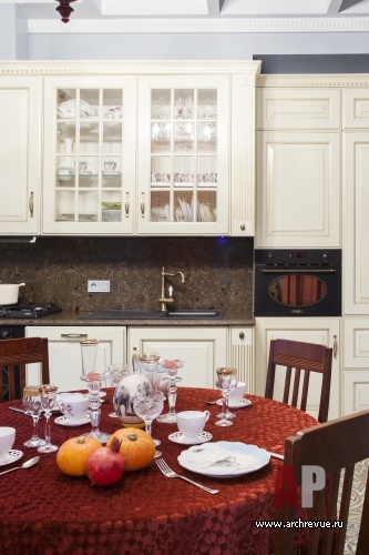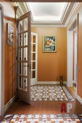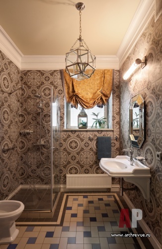 «Заказчица – очень светлый и позитивный человек, любительница ярких красок и смелых решений, поэтому за основу цветового решения мы взяли насыщенный терракотовый оттенок, теплый и активный», - рассказывают авторы проекта. К нему они подобрали английскую керамику, испанскую плитку с синим орнаментом и состаренным эффектом, обои и текстиль с викторианским орнаментом.