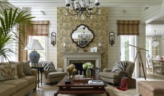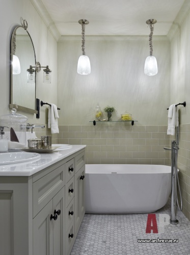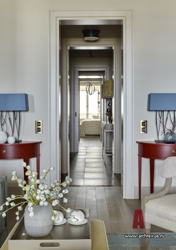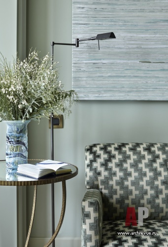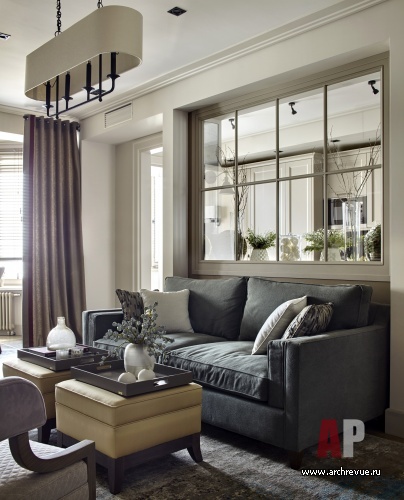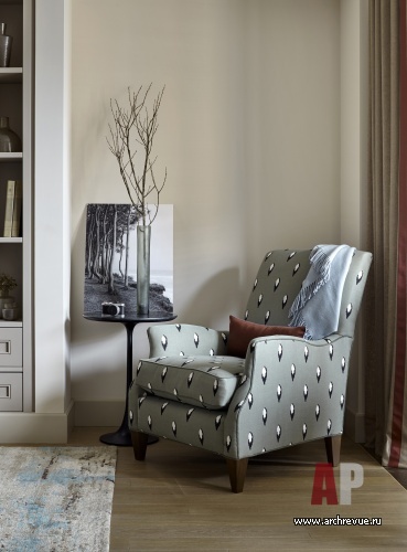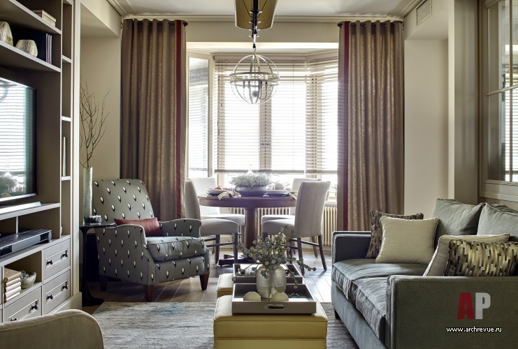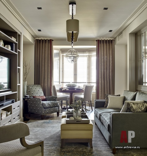 Гостиная диван в обивке Antoine D’Albiousse, кресло в обивке Jim Thompson, на заказ, изготовление ROSBRI, оттоманки Marie's Corner в обивке тканью The Isle Mill, кресло Vanguard Furniture, консоли Morelato, столики Crate and Barrel, встроенный шкаф, на заказ, изготовление «Атрибутэ»