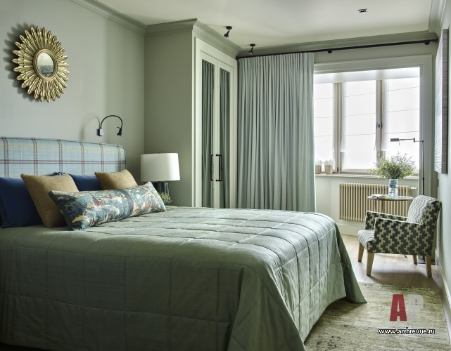 Спальня встроенные шкафы, на заказ, изготовление «Атрибутэ»; прикроватные столики, Blanc D`ivoire, кресло, Marie's Corner, столик Crate and Barrel