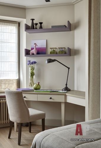 Детская дочери кровать Vispring, туалетный столик Homes in Heaven, банкетка Marie's Corner (обивка, ткань Gaston y Daniela), встроенные шкафы, рабочий стол, стеллаж, на заказ, изготовление «Атрибутэ», стул Charrell
