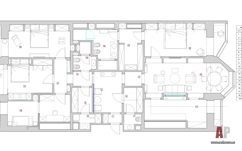 Поскольку дизайнер видела квартиру со старым ремонтом и отталкивалась от плана БТИ, то существующий образ квартиры подсказал необходимые изменения. Прежде всего она предложила придать интерьеру классический настрой, сделать удобные изолированные помещения, визуально увеличить потолки. План пришлось полностью изменить, адаптировать квартиру для семейного проживания с тремя детьми. Расположение комнат определили окна: центральную часть квартиры в форме вытянутого прямоугольника заняли темные «помещения» - входная группа, блок ванных комнат, гардеробные, технические комнаты.