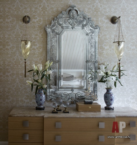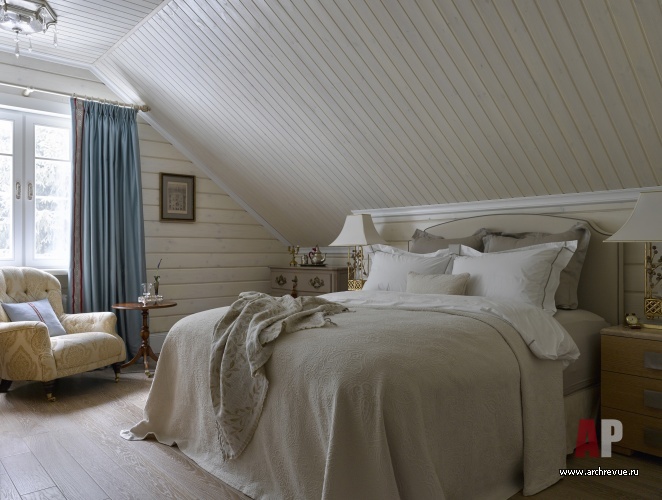 Спальня хозяйки кровать Treca Interiors Paris, кресло Ralph Lauren, комод и прикроватная тумба Flexform