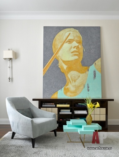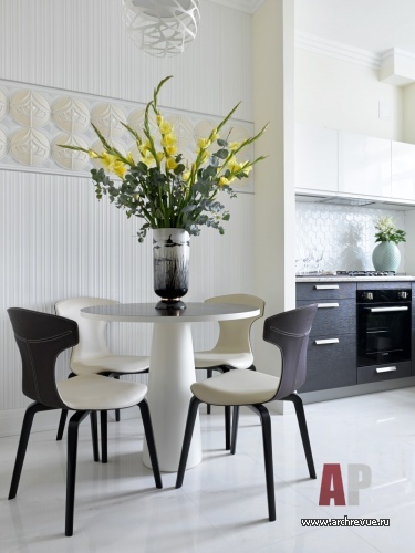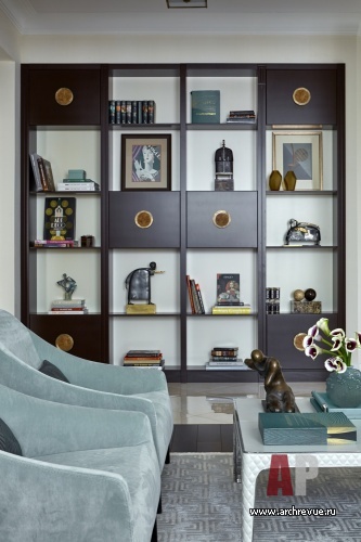 Вторая характерная особенность интерьера – авторская мебель: созданные на заказ изделия в стиле ар-деко, появились в каждом помещении. Необычайно изысканно оформлена зона для завтраков на кухне: при реконструкции помещения в центре стены была обнаружена ниша, сделанная для кухонного фартука, ее не стали маскировать, а наоборот акцентировали с помощью гипсового барельефа с орнаментом, вдохновленным декоративным панно Фрэнка Ллойда Райта для часовни Святого Креста в Аризоне. Образ эстетского интерьера завершают подлинные предметы искусства конца XIX – начала XX веков: стеклянные вазы Рене Лалика, японский фарфор с золочением, акварели Натальи Гончаровой, а также работы современных живописцев.
