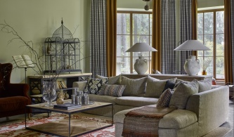 Интерьер решен в светлой цветовой гамме с контрастными декоративными акцентами в виде обивки мебели, ковров, изделий из темного дерева. «Заказчица изначально хотела все сделать светлым, включая пол, но нам удалось ее убедить ввести темное дерево – массивную доску из американского ореха под маслом, авторские предметы из экзотических пород дерева. Они позволили избежать монотонности, скуки», - рассказывает автор проекта.