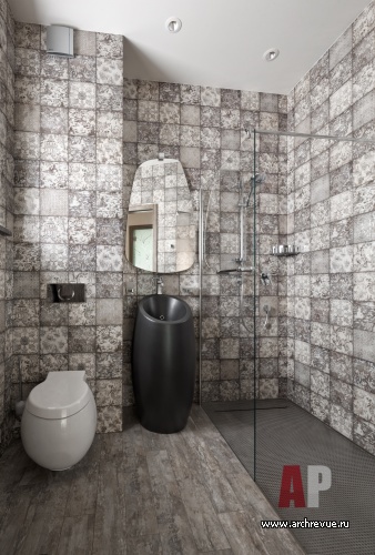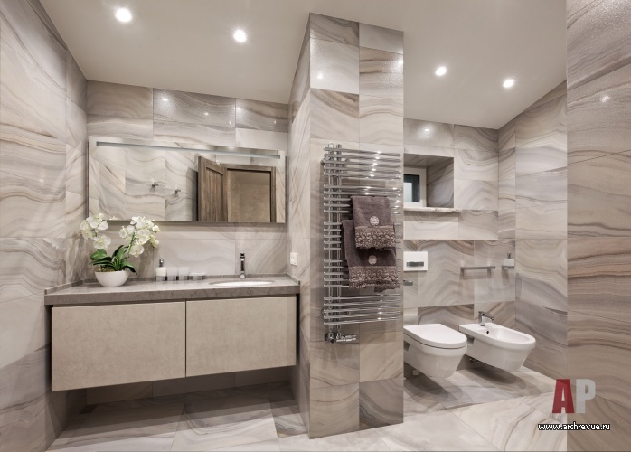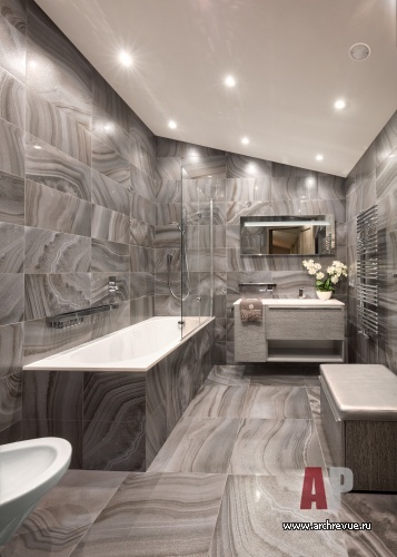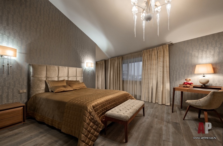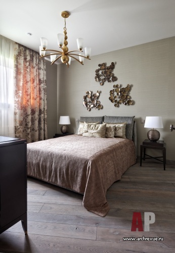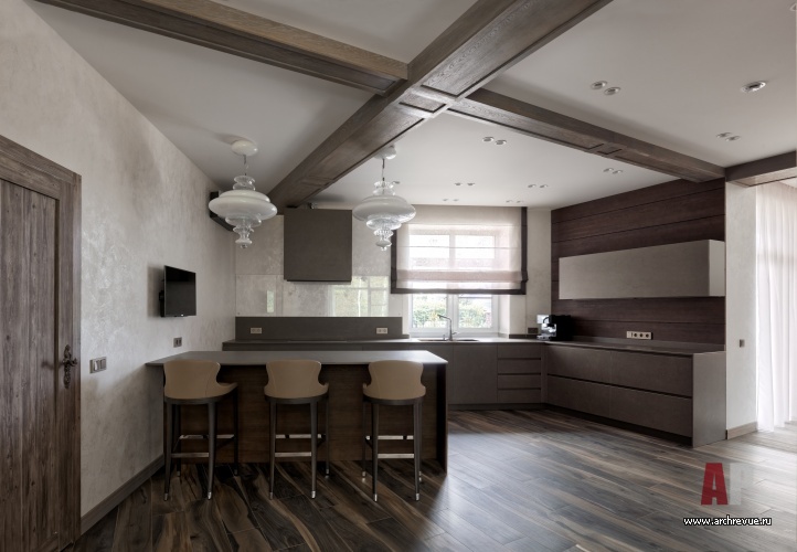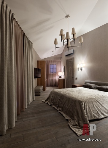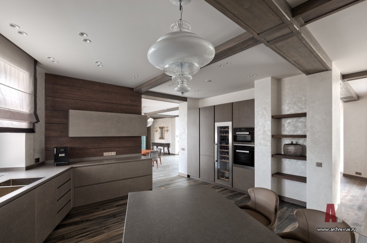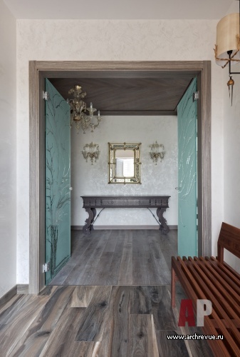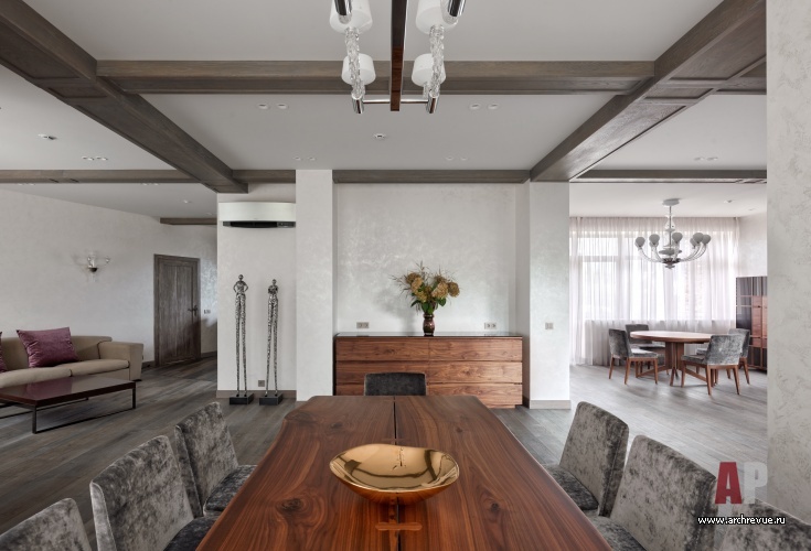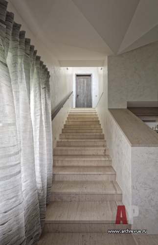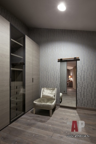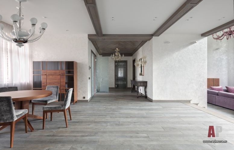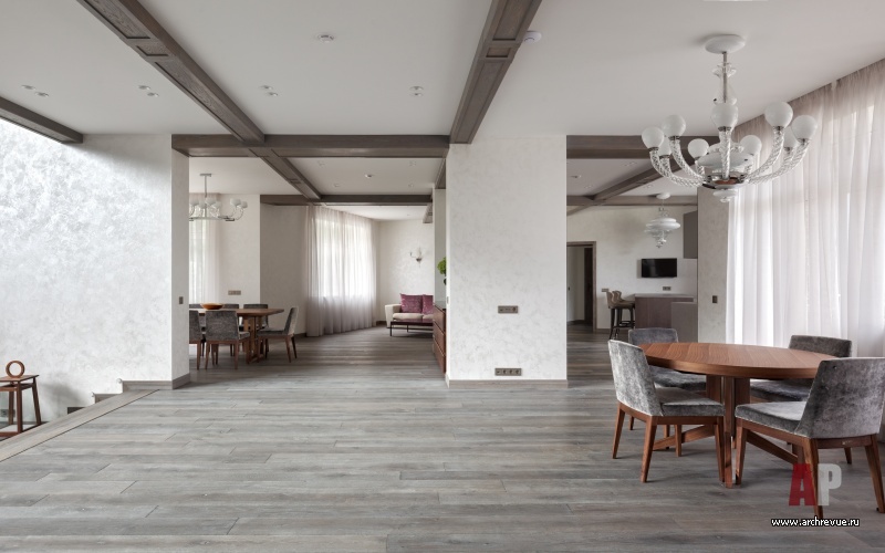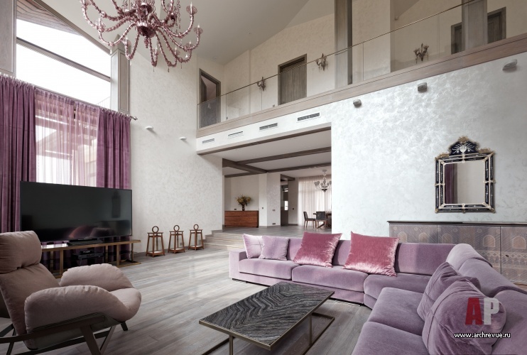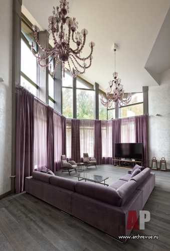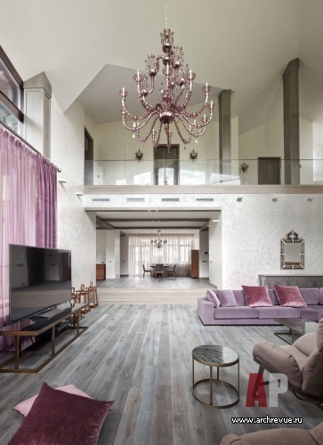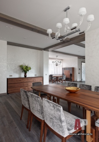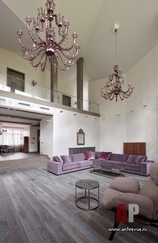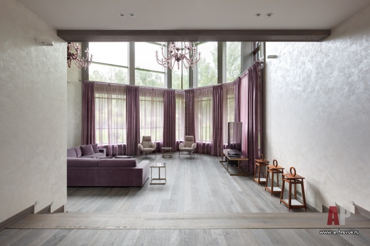 Потому центральными акцентами гостиной стали роскошные венецианские люстры из цветного стекла, предметы мебели в стиле ар-деко, а также лиловый текстиль, но не ярко-сиреневый, а приглушенный, пепельный, изысканный и деликатный. Основной объем исполнен в спокойной современной стилистике и сложной серо-жемчужной цветовой гамме. Стены оформлены декоративными штукатурками на базе «венецианки», на полу – массивная доска из ясеня с медовым оттенком, потолки оформлены декоративными балками из дуба серо-пегого цвета, из похожей древесины выполнены двери. Раздвижные перегородки и ограждение балкона второго этажа изготовлены из бесшовного стекла. Все помещения на верхнем уровне декорированы обоями из коллекции одной фабрики - Armani Casa. Интерьер не перегружен деталями, он решен как единая композиция, цельная и законченная.