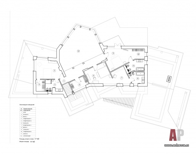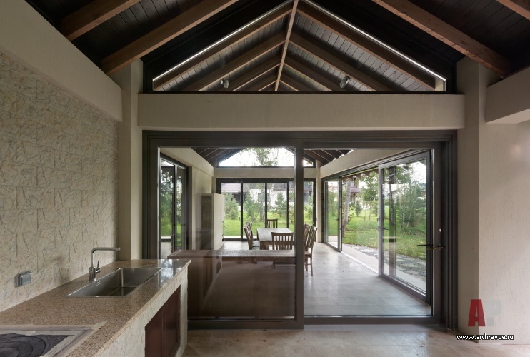 Уровнем ниже, в остекленном угловом эркере, расположена гостиная с большой высотой потолка, балконом второго этажа и панорамным видом на участок. Помимо парадных помещений на первом уровне расположены две гостевые спальни, тренажерный зал и технические помещения. Второй этаж занимают приватные помещения: три спальни со своими ванными комнатами и гардеробными. Цокольного этажа в доме нет. При работе с пространством архитектор стремилась скорректировать асимметричность исходного архитектурного плана (с острыми углами, скошенными потолками) и при этом сохранить ощущение простора и движения воздуха.