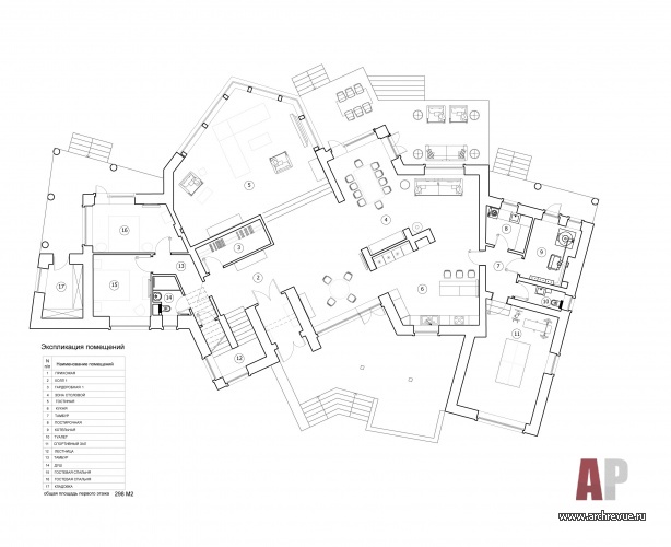 Работа над домом началась с исправления конструктивных ошибок застройщика, укрепления несущих элементов и перекрытий и нарезки помещений в объеме со сложной конфигурацией. Большую часть первого этажа занимают общественные помещения: парадный холл, перетекающий в зону кухни-столовой – просторной, открытой, воздушной.