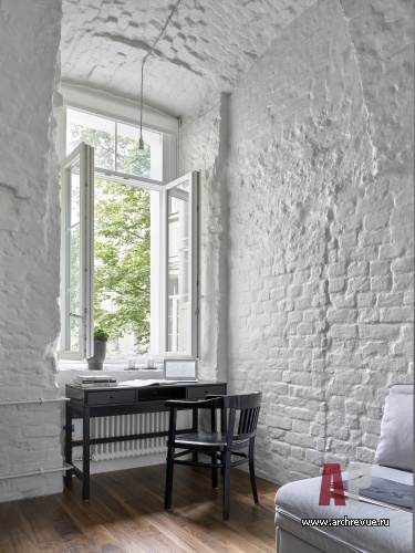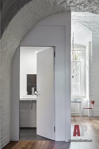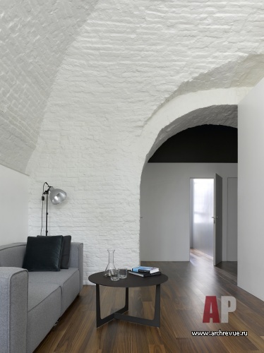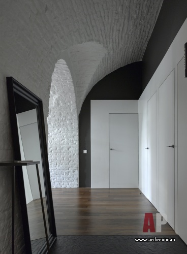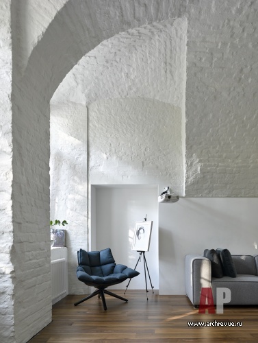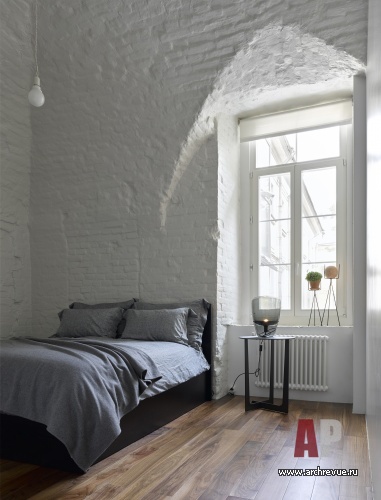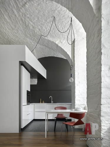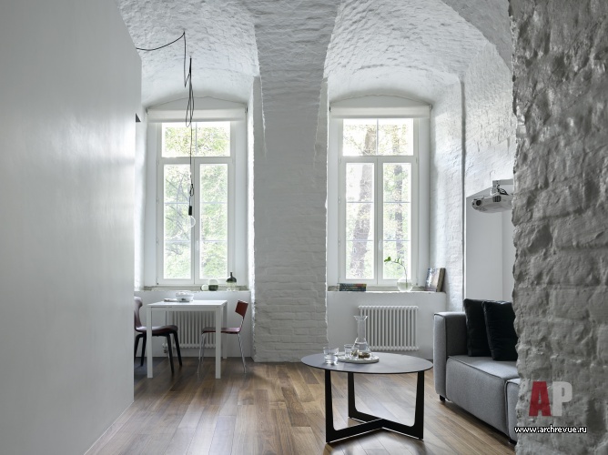 Интерьер исполнен в минималистском ключе и монохромной цветовой гамме с натуральными материалами и дизайнерскими предметами. Мощный декоративный акцент пространства – историческая кирпичная кладка стен с высокими арочными сводами. Архитекторы сбили со стен все слои штукатурки, открыли фактуру старинного кирпича. Чтобы не затемнять интерьер квартиры, расположенной на первом этаже, они выкрасили стены в белый цвет: они отражают свет и дают воздух.