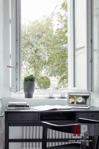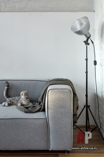 На контрасте с белыми стенами, дверями, встроенными элементами мебели решен кубический объем. Его стена со стороны кухни выкрашена в темный серый цвет, что подчеркивает геометрию, усложняет пространство. В нейтральной гамме подобраны все отделочные материалы: полы мокрых зон и холла облицованы черным сланцем, жилых помещений – древесиной американского ореха. Богатую фактуру кирпича, оттеняет минималистичная обстановка. Мебели немного, только самое необходимое. В их числе кресло: серо-голубое кресло Husk производства B&B Italia – один из самых любимых объектов хозяина – и черный письменный стол, который переезжает из квартиры в квартиру.