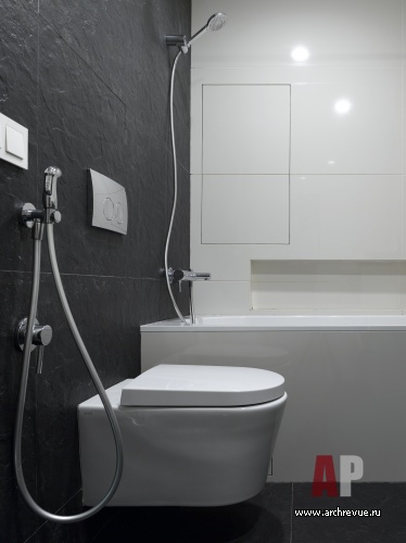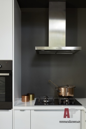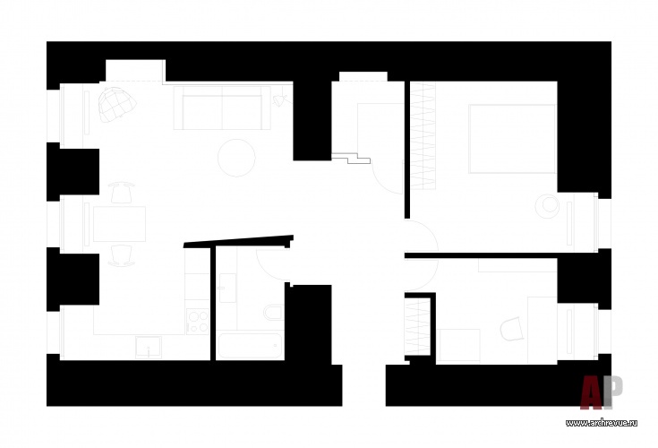 Квартира разделена на два блока: объединенную общественную часть и приватную (она включает спальню и детскую, которая также используется как кабинет). При зонировании использован частый прием мастерской za bor — обособление встроенного объема. Внутри белого куба, в гостиной, находится санузел. Одна из его стен образует нишу, с кухонным оборудованием, другая, обращенная к дивану, служит экраном для проектора.