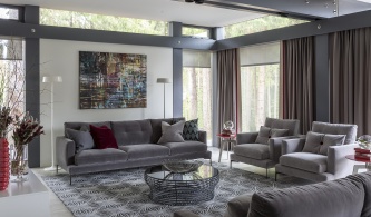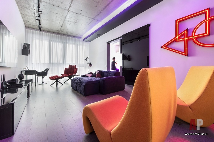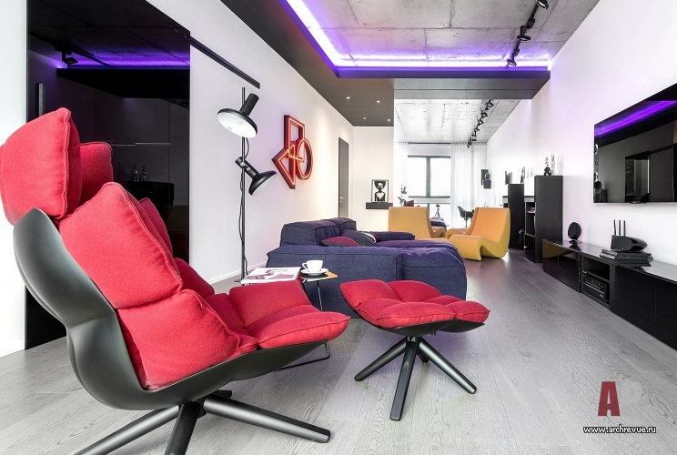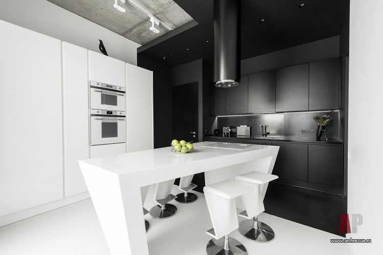 Интерьер решен в современной стилистике, с использованием инновационных материалов и дизайнерских предметов. Брутальный характер пространства подчеркивает бетонный потолок, с которым контрастирует черный глянец раздвижной двери, отделяющей кухню и гостиную. На контрасте черного и белого выстроены практически все помещения: от прихожей до спальни и ванных. Еще одна отличительная особенность проекта – игра с пространством, оптические иллюзии, которые архитекторы мастерски создают с помощью зеркальных плоскостей, глянцевых поверхностей и светодинамической подсветки.
